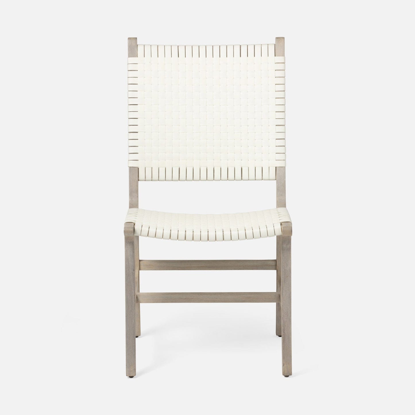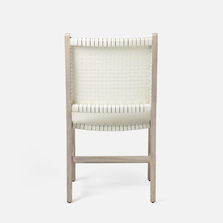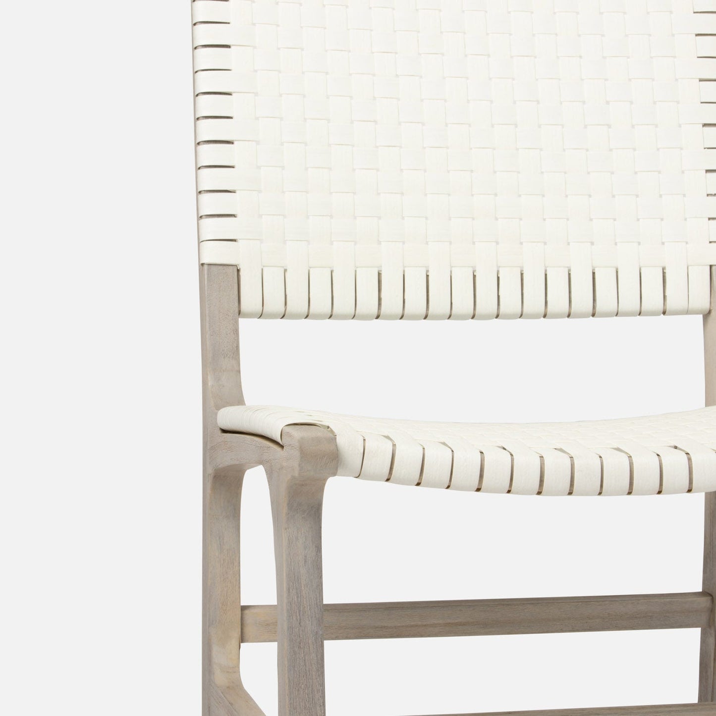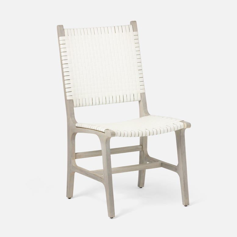The Rawley Side Chair in White and Gray Teak from Made Goods is made of faux rattan made to withstand the elements. Woven, basketweave strips create the back and seat. An airy teak wood base completes this retro-yet-modern collection.