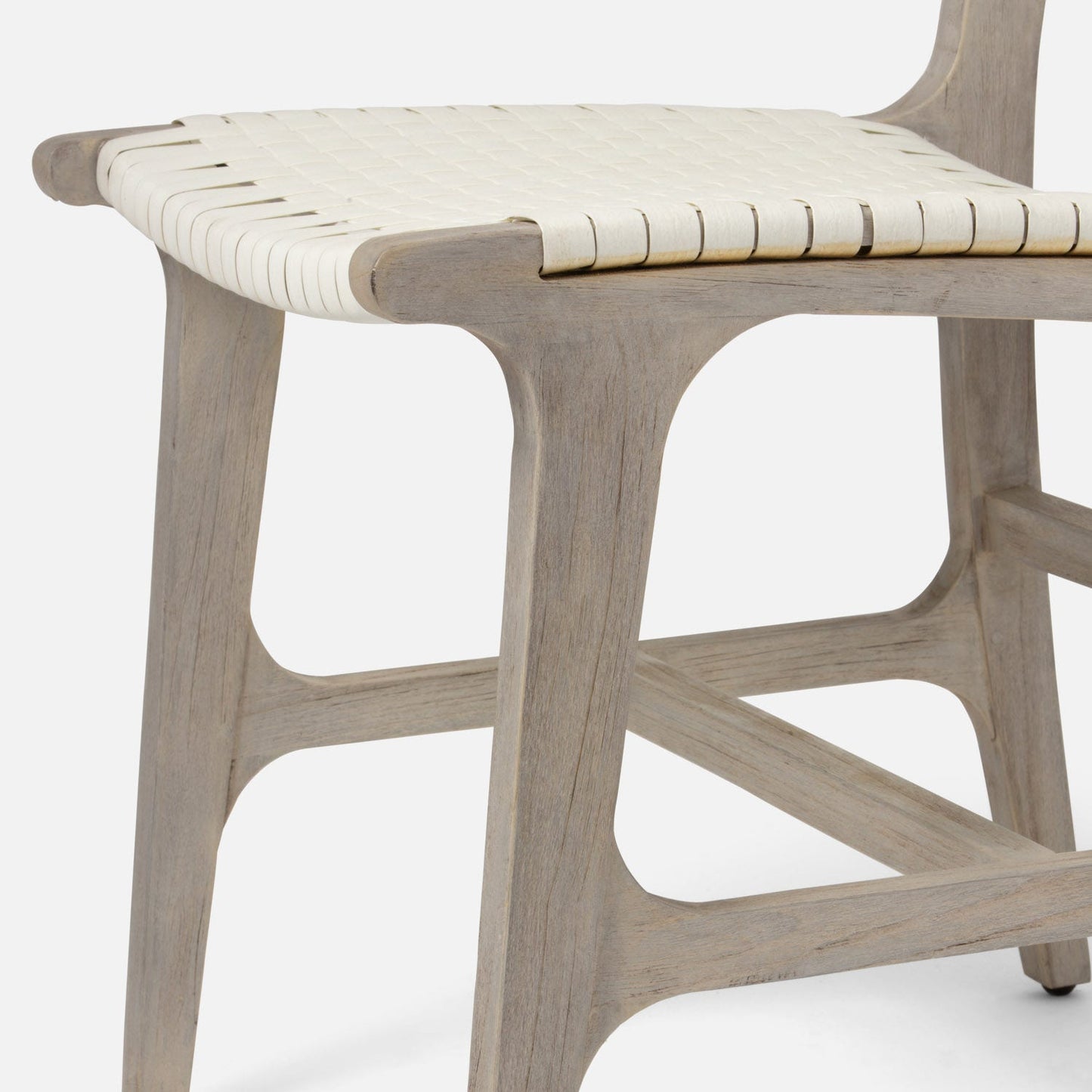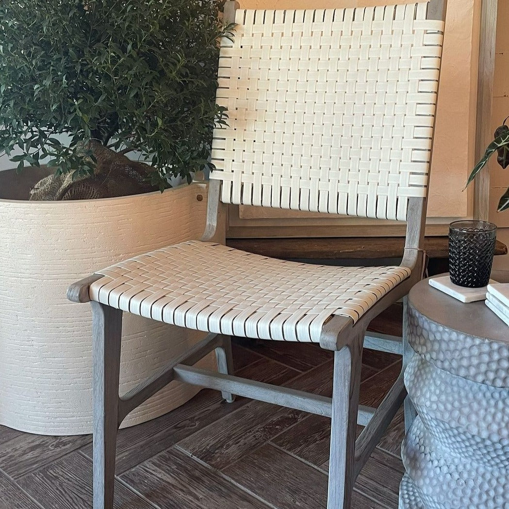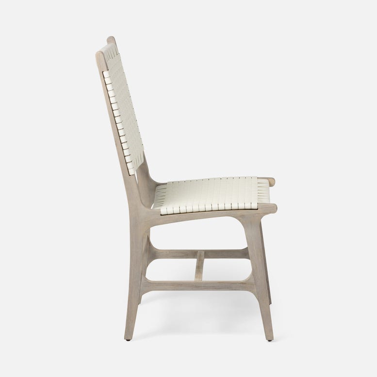 The Rawley Side Chair in White and Gray Teak from Made Goods is made of faux rattan made to withstand the elements. Woven, basketweave strips create the back and seat. An airy teak wood base completes this retro-yet-modern collection.