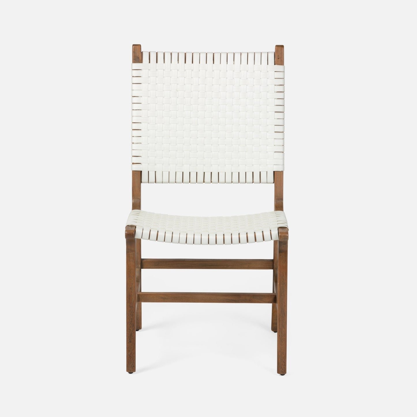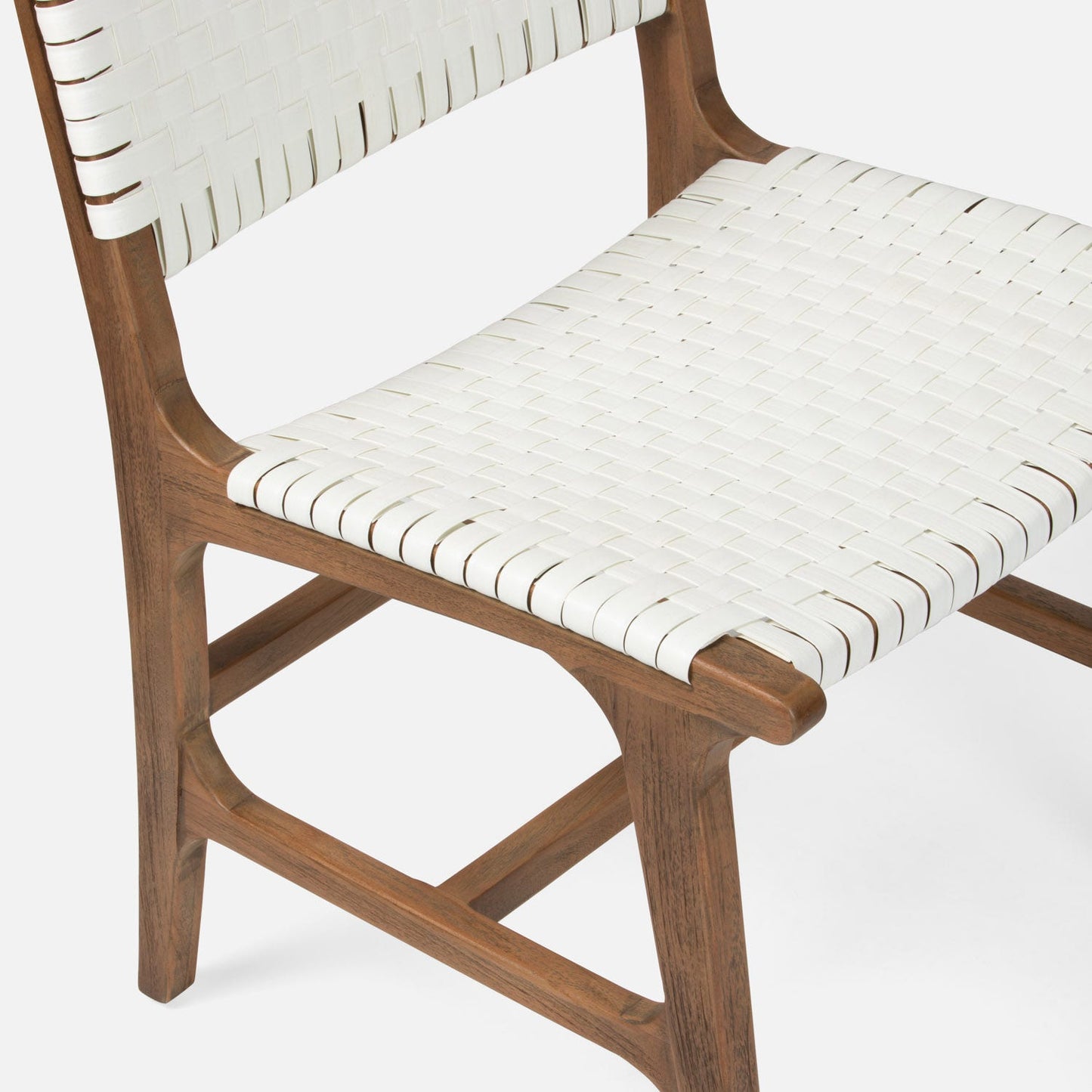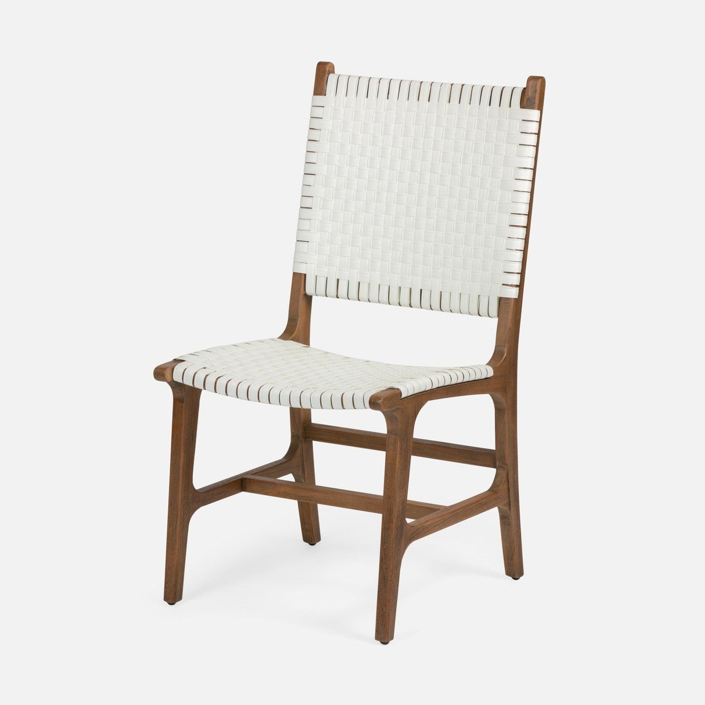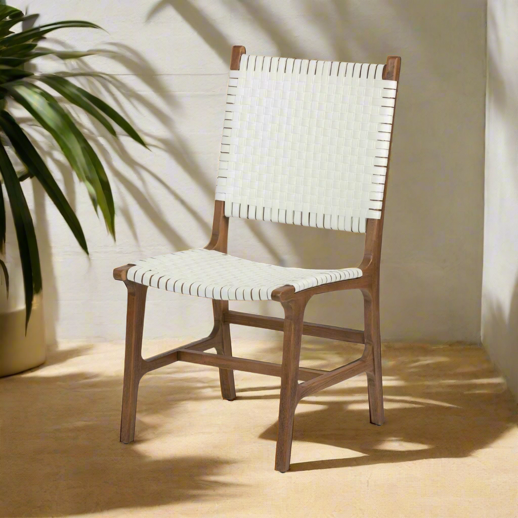 The Rawley Side Chair in White and Natural Teak from Made Goods is made of faux rattan made to withstand the elements. Woven, basketweave strips create the back and seat. An airy teak wood base completes this retro-yet-modern collection.