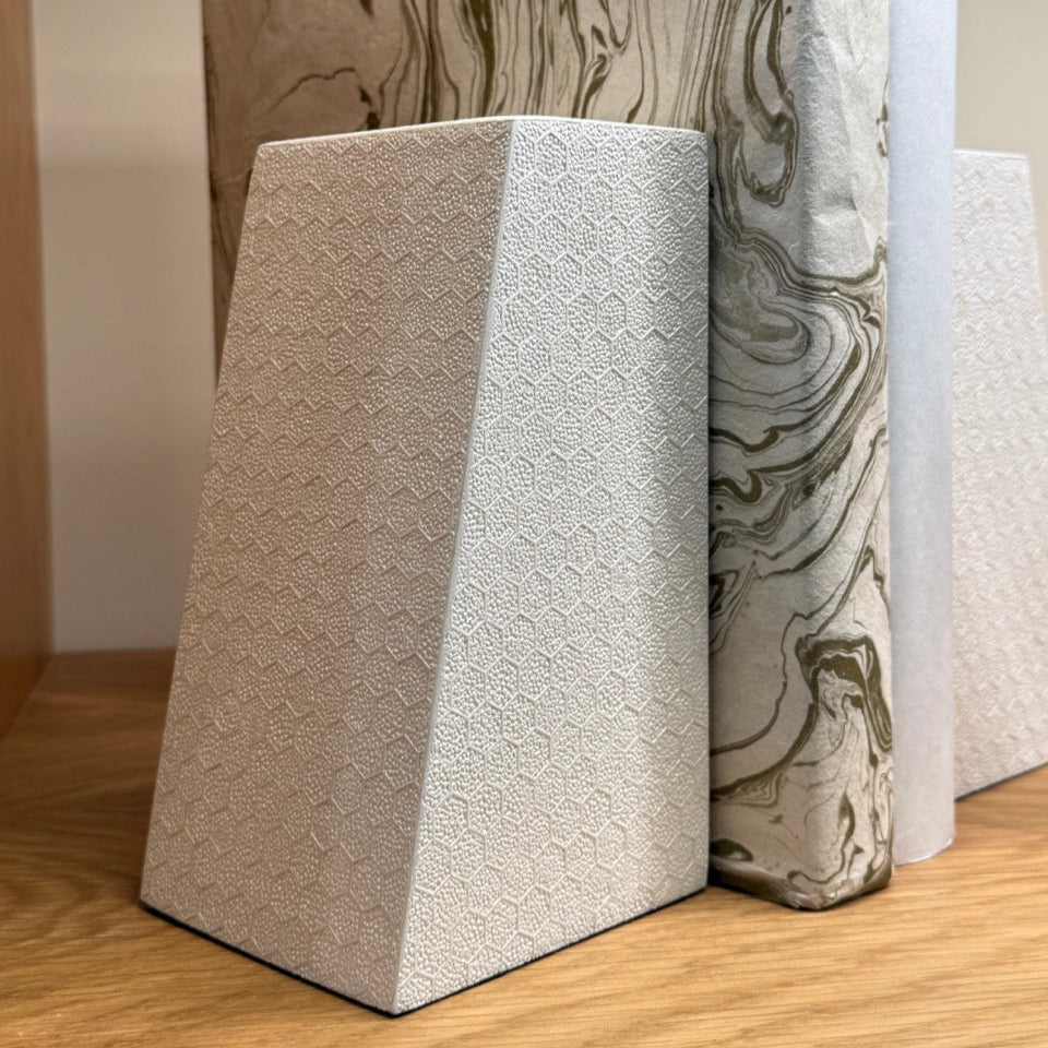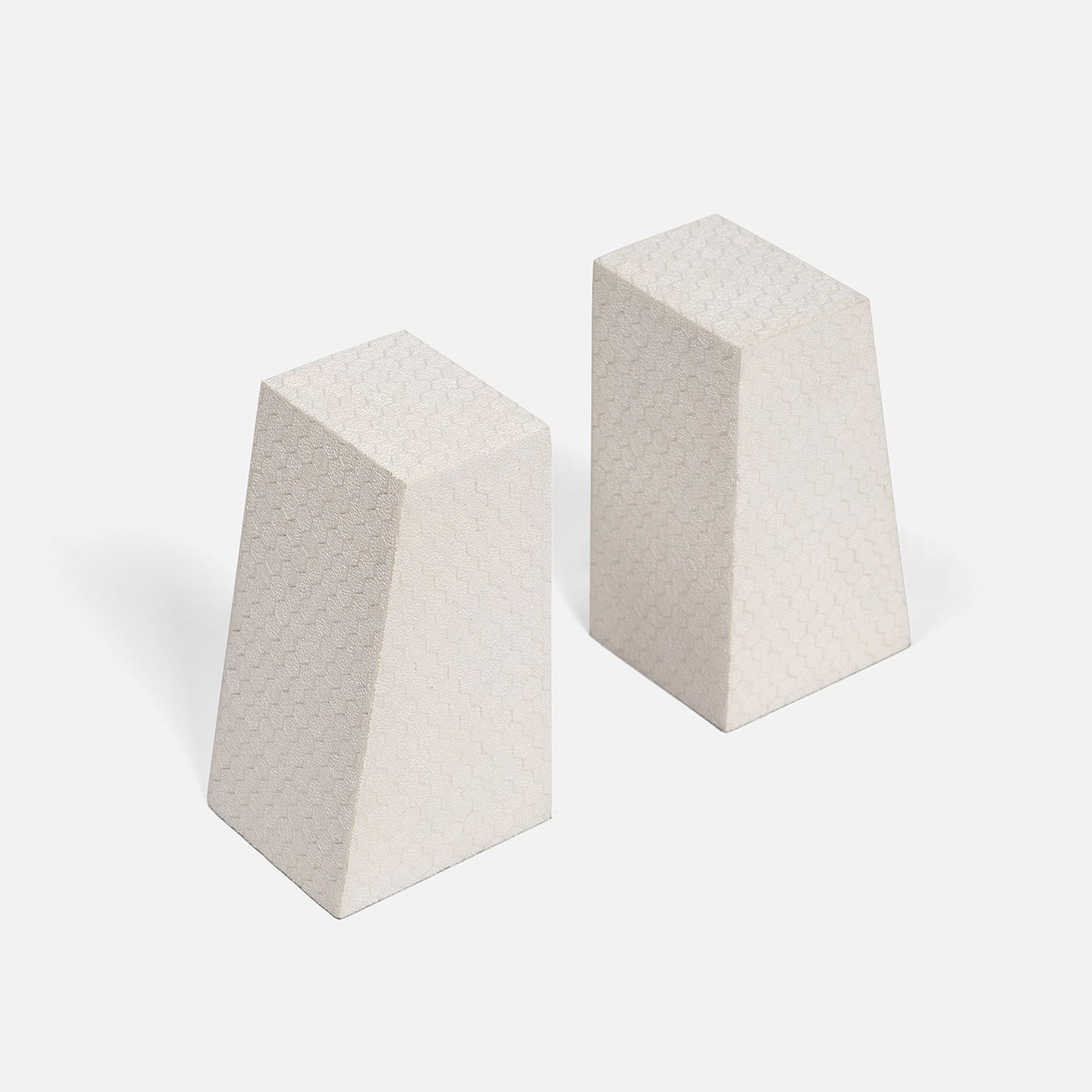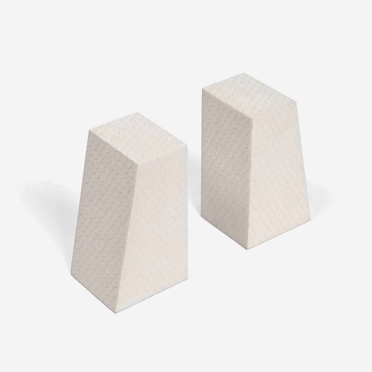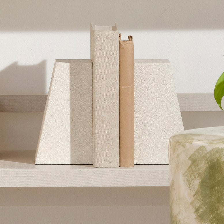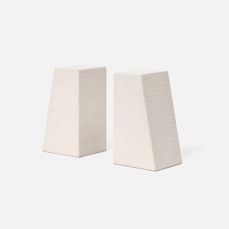 The Rene Bookends in Blanc by Made Goods feature bold shapes with textured faux shagreen. Designed to support heavy books, their angled edge adds a refined architectural touch to any space.