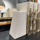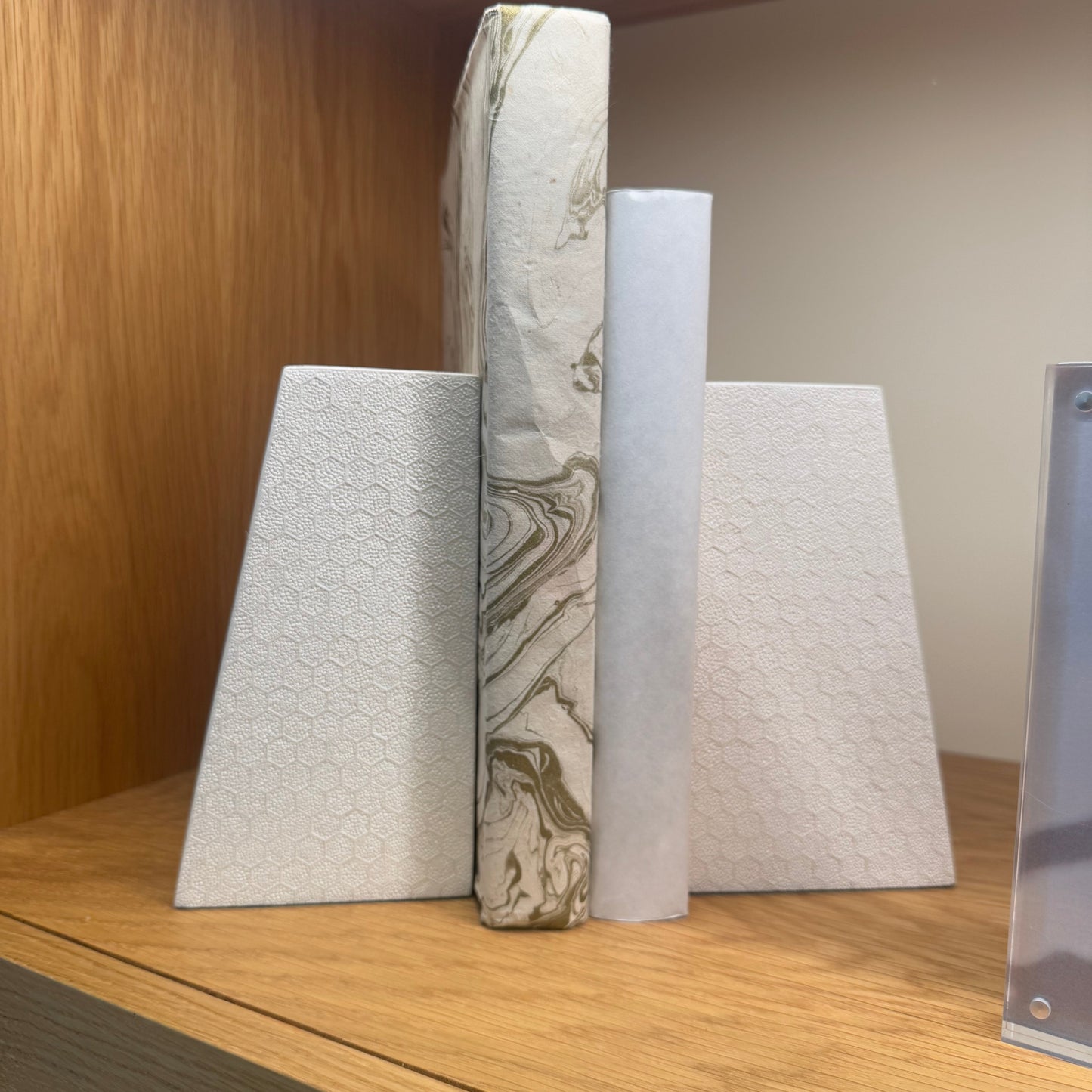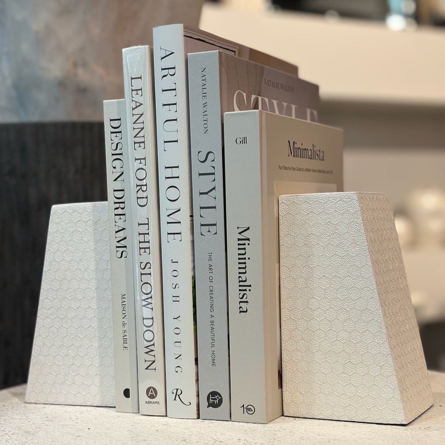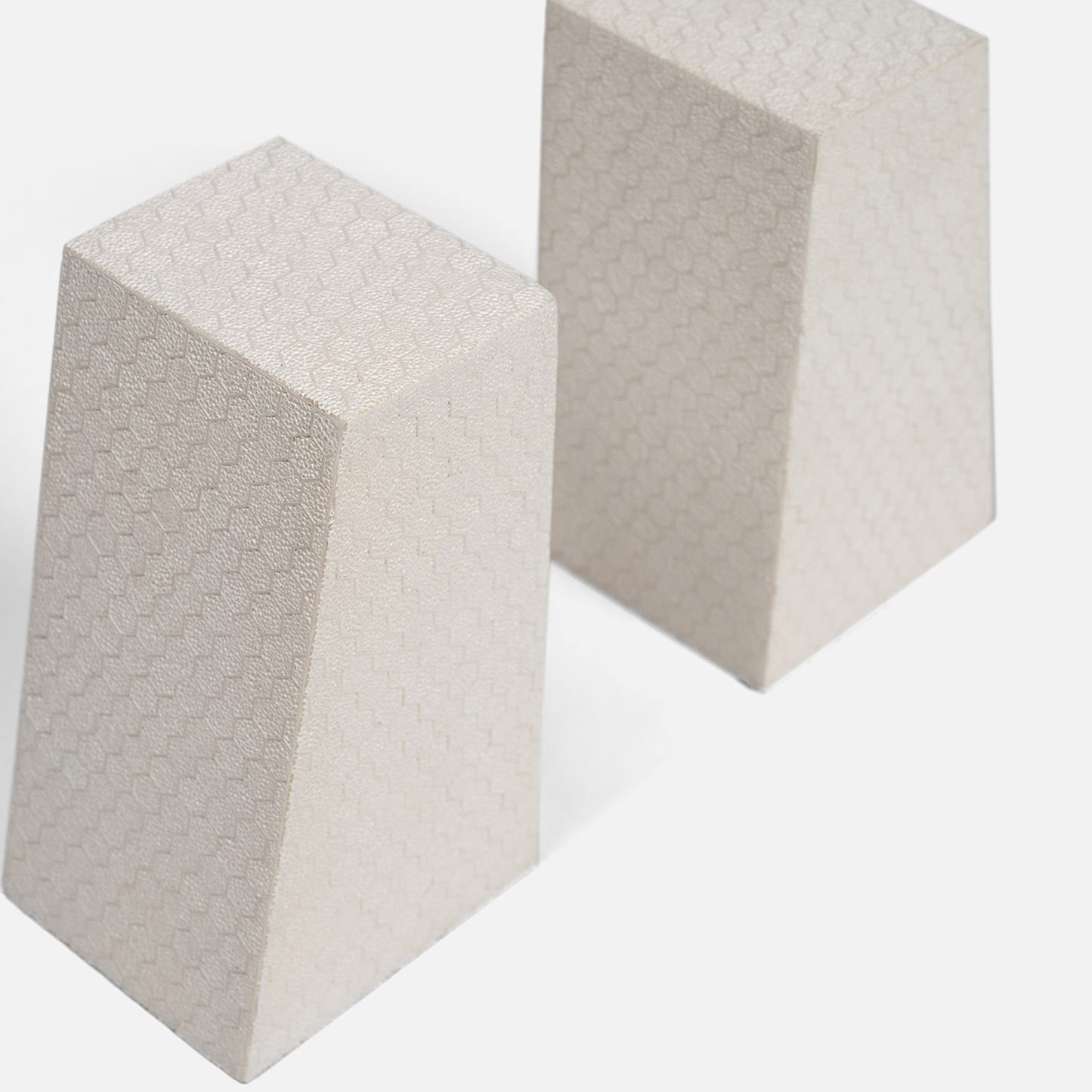 The Rene Bookends in Blanc by Made Goods feature bold shapes with textured faux shagreen. Designed to support heavy books, their angled edge adds a refined architectural touch to any space.