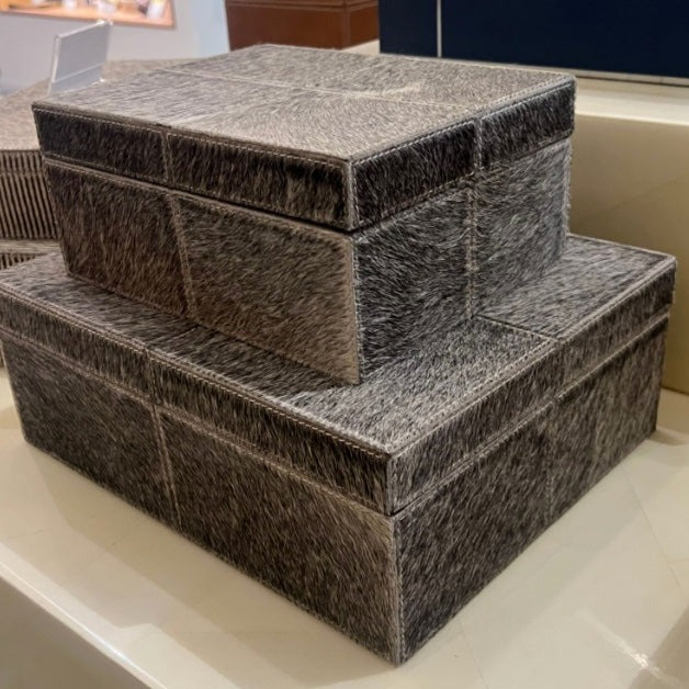 Made Goods' Roger Box Set Gray Hair-on-Hide features a patched cowhide box with natural variations in color and texture. The durable, high quality leather may show markings and a distressed appearance, adding character to the collection.