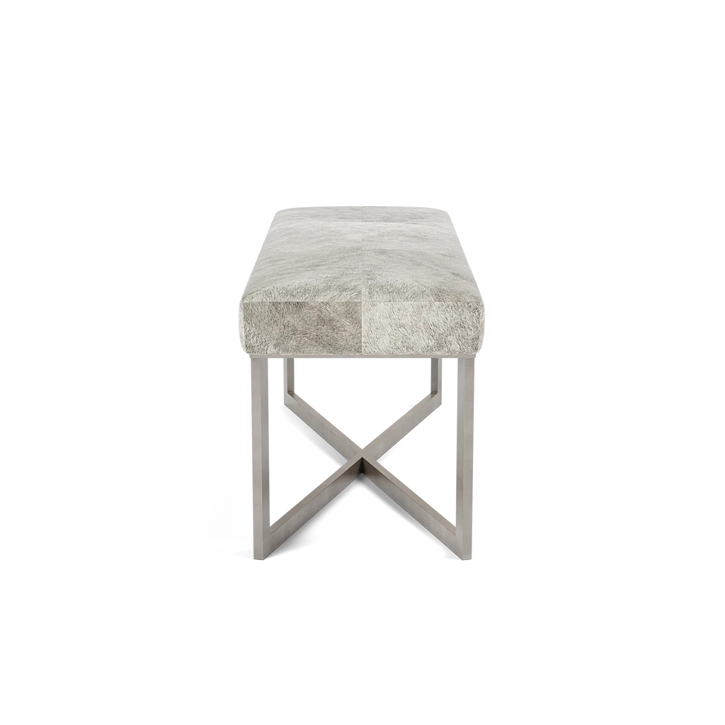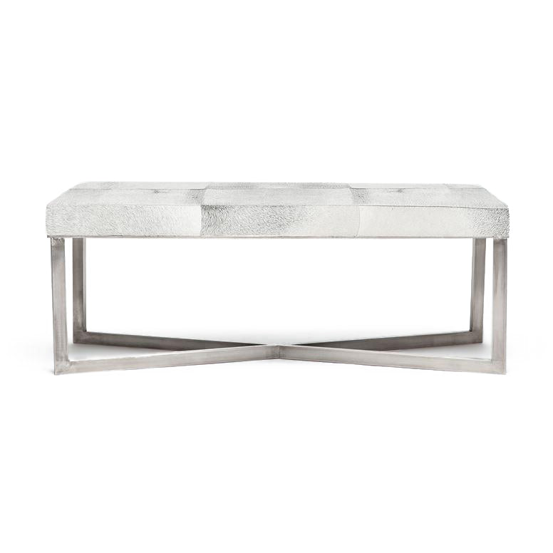 Benches shaped like a rectangle, as reflected in the Roger Double Bench in Gray Hair on Hide from Made Goods, embody contemporary design with an exotic touch. Supported by a crisscrossing silver metal base, this luxurious modern seating features a cowhide cushion that exudes a high-end vibe. *Natural variation to be expected.