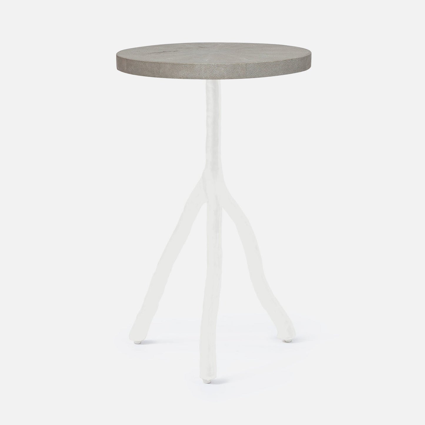 The branch-like Royce Side Table in White and Sand Faux Shagreen from Made Goods is inspired by nature with both glam and an industrial vibe. The Royce Side Table features a brushed finish that adds a light-catching texture.