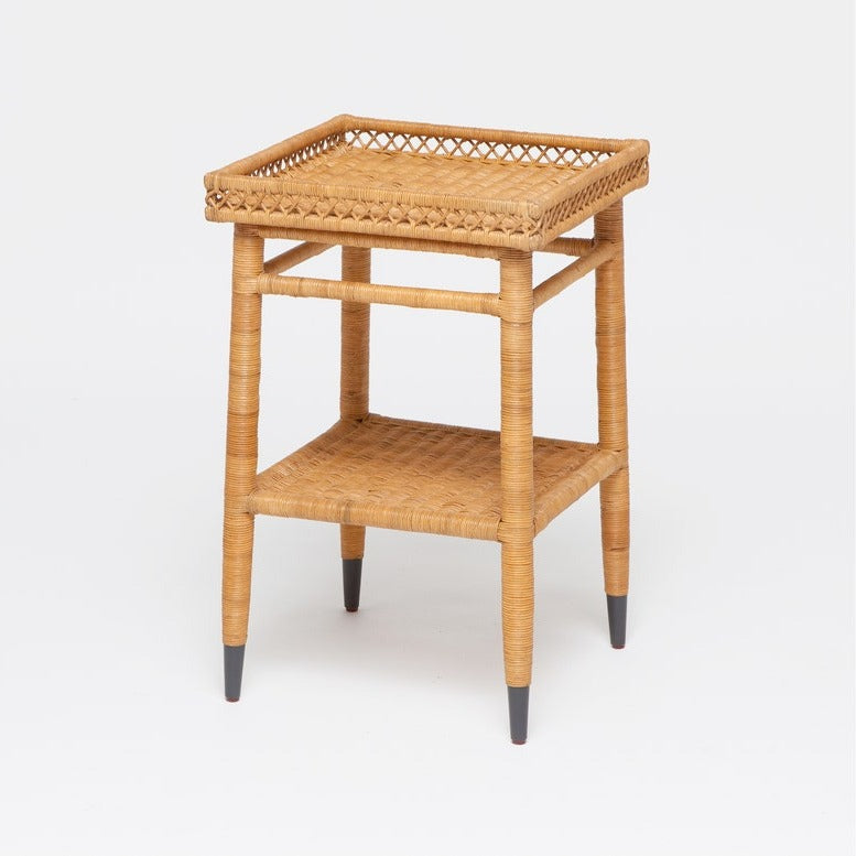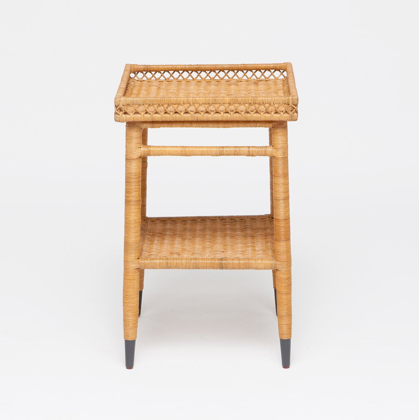Made Goods Sarah Single Nightstand in Natural Rattan, a single side table, offers casual, contemporary elegance. The tray designed top of this square bed side table provides space for a lamp while a bottom shelf is available for books or decorative items.
