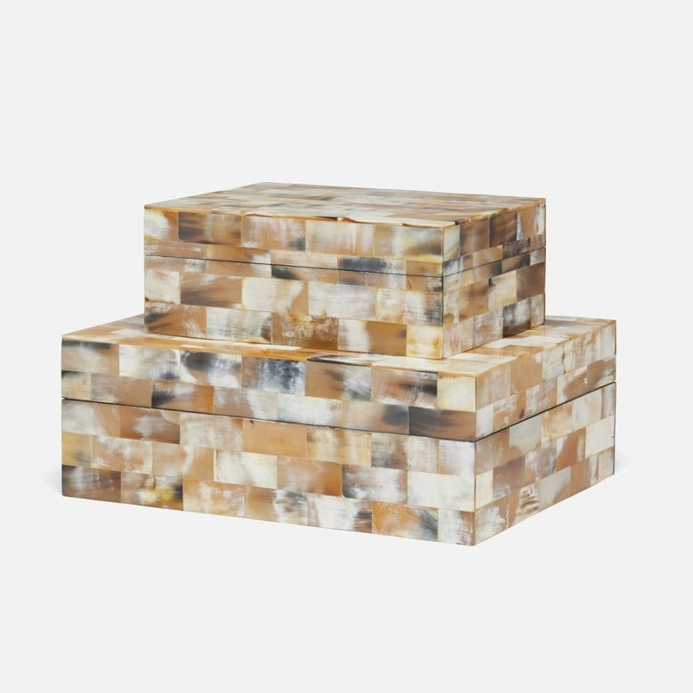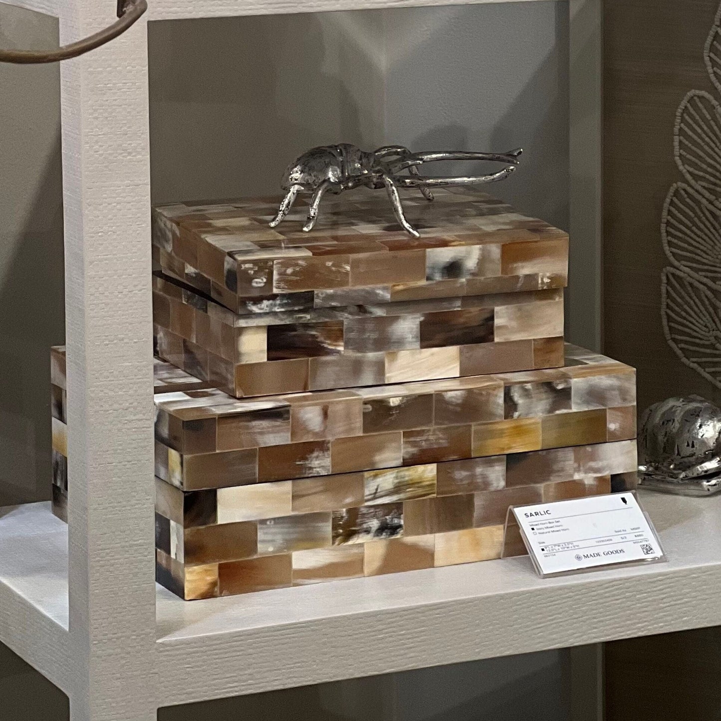 The Sarlic Box Set in Mixed Horn from Made Goods is unpolished for an eye-catching matte finish. The boxes interior in linen in an elegant cream linen.