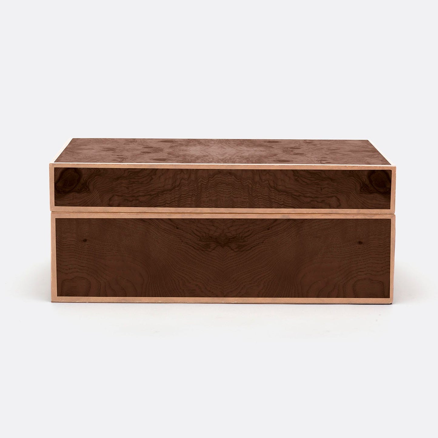 Organize in style with Shea Box, a large veneer storage option from Made Goods. Olive ash and walnut are used in the construction, accented by a light wood trim.