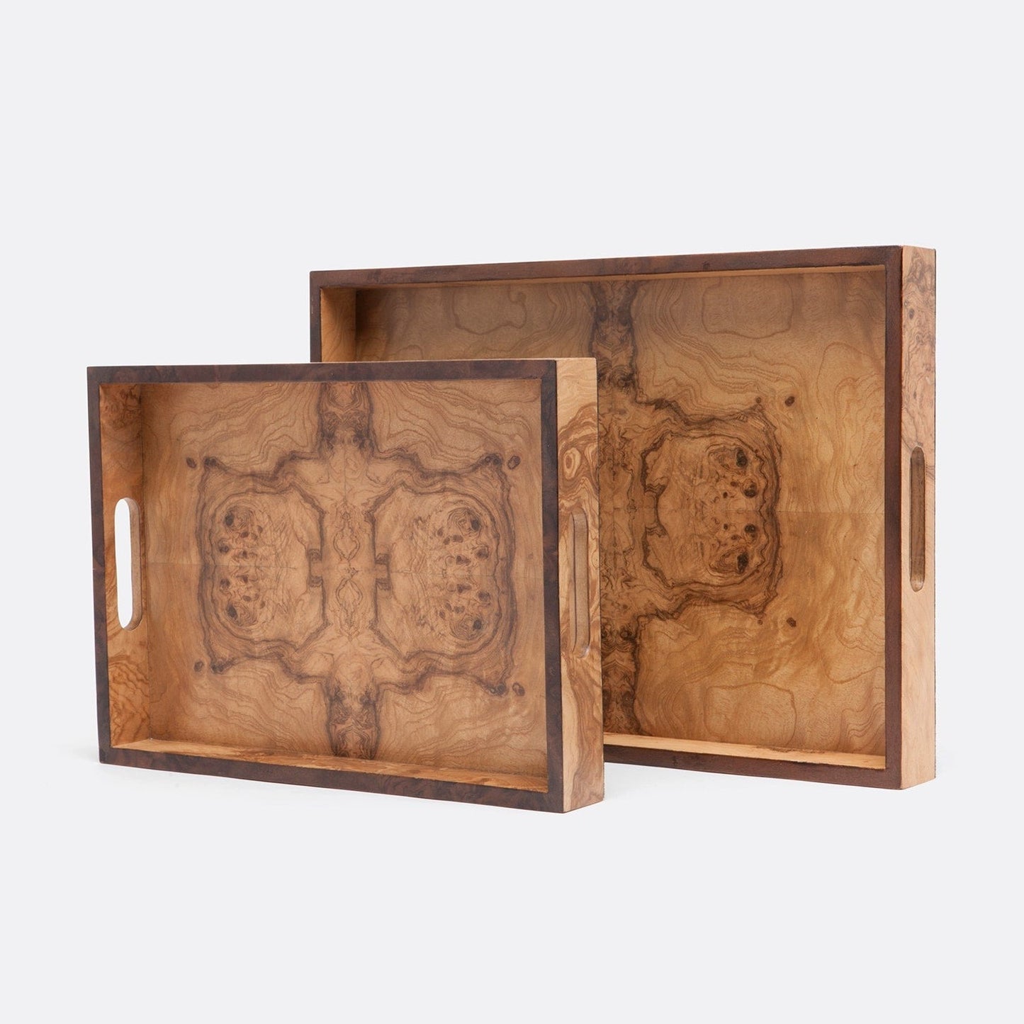 The Shea Tray Set in Olive Ash Veneer from Made Goods features 2 rectangular olive ash and walnut contrasting wood trays with a split pattern veneer. Trays like the Shea are perfect for decorating coffee tables.