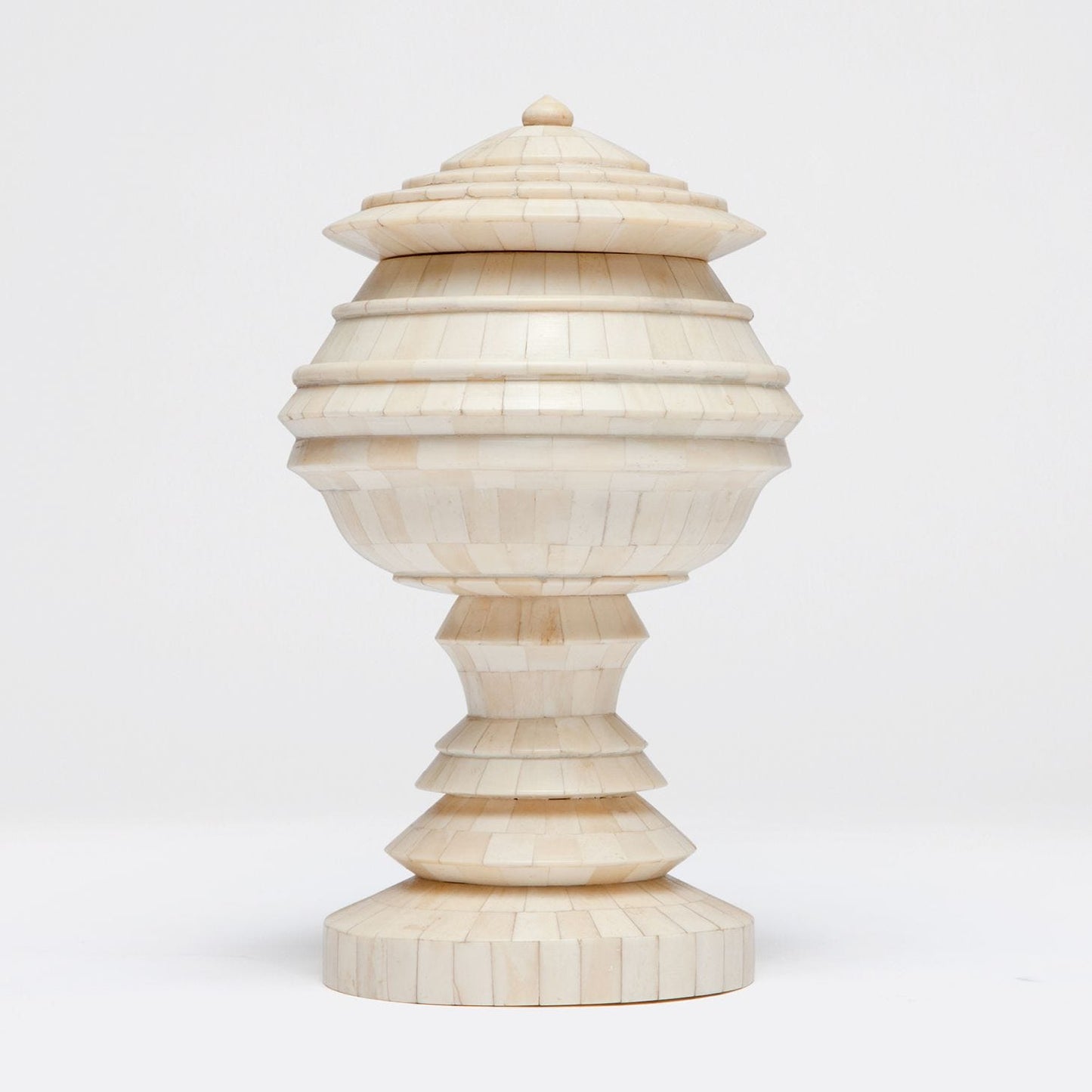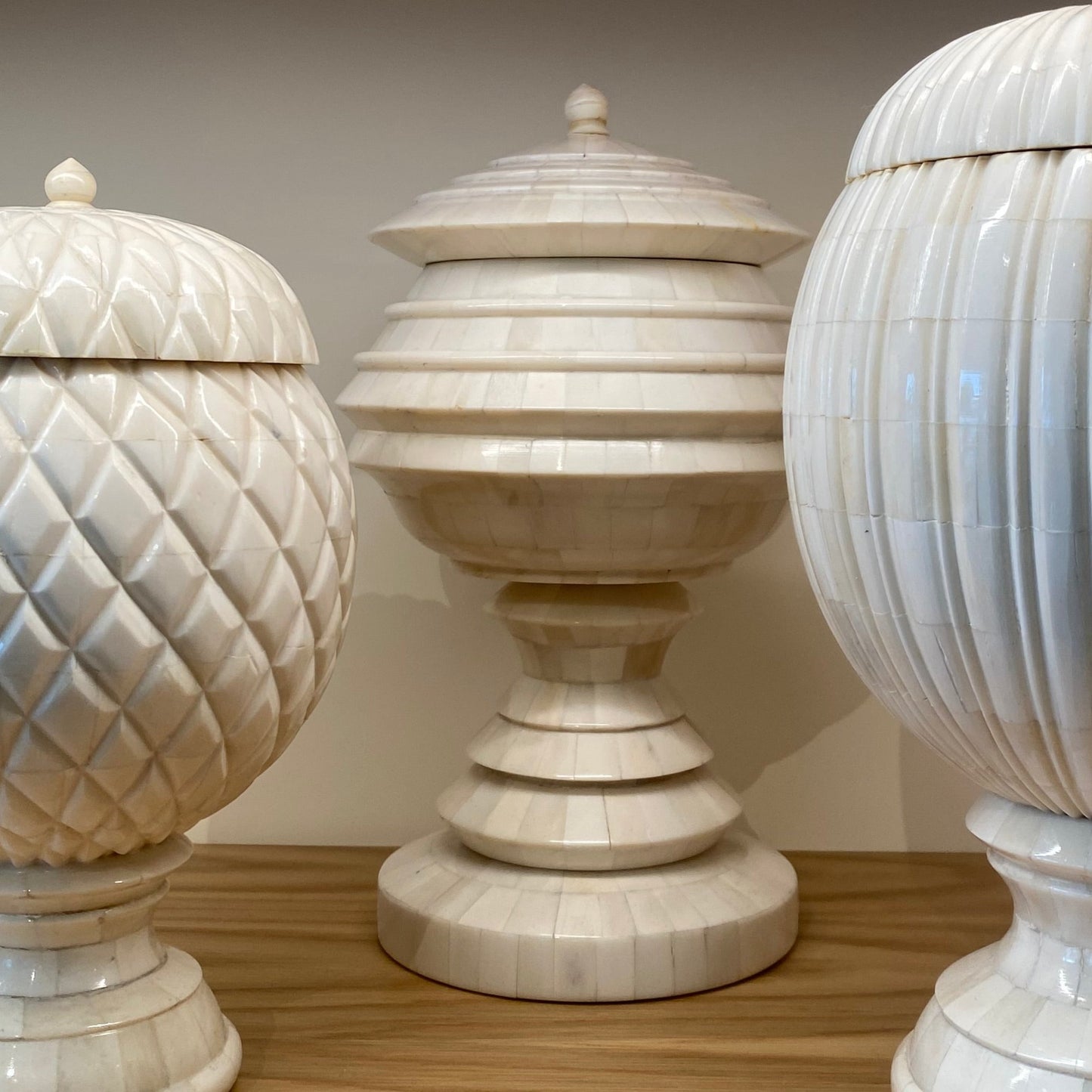 The Silkah Urn in Bone from Made Goods is made of natural bone with horizontal ribs. The striations on the surface are texturally rich and make this the perfect accessory for traditional to contemporary spaces or interiors alike.