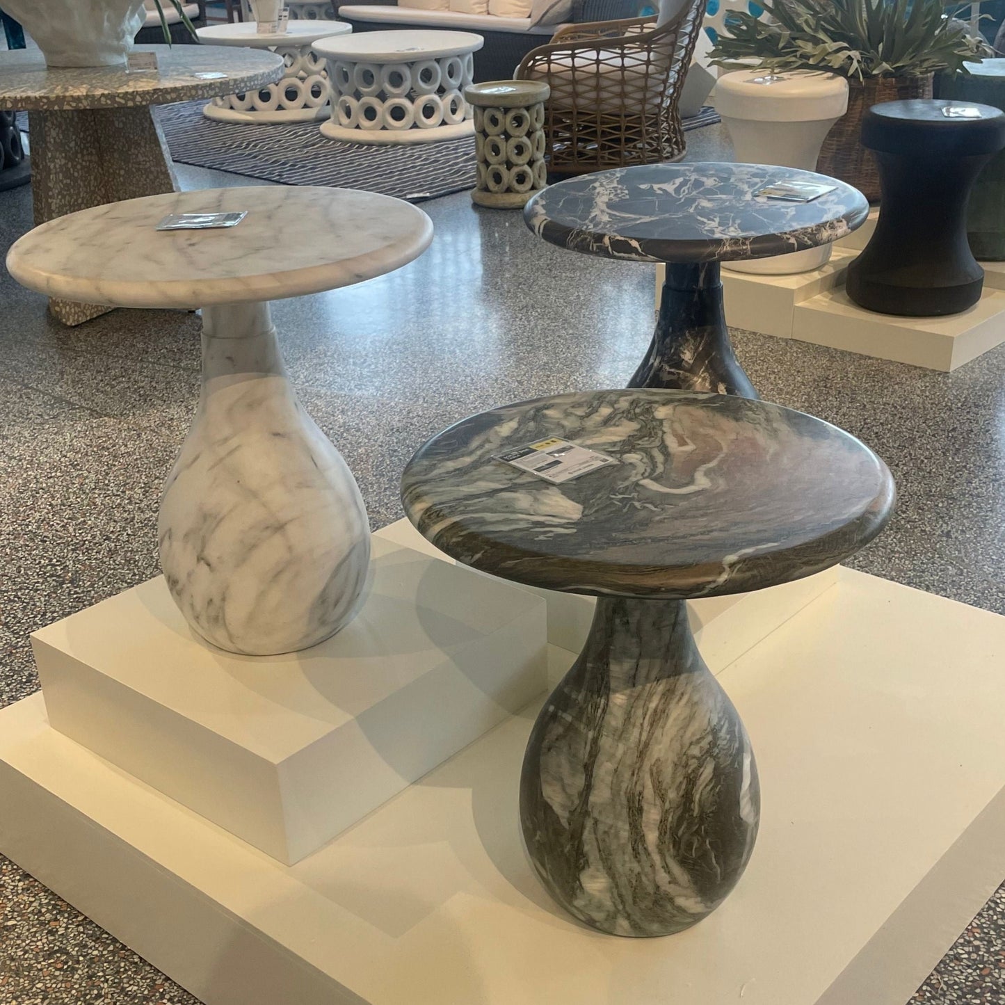 The Sophie Side Table in Forest from Made Goods entices one to swirl into stylish outdoor gatherings with an elegant teardrop shape. Both the tabletop and base are created from a faux marble material, evoking a timeless appearance.