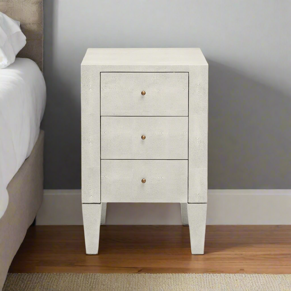 The contemporary Sorin 3 Drawer Single Nightstand in French Gray from Made Goods features faux shagreen that works equally well as a sofa side table. This small side table offers antiqued brass hardware and self closing drawers, culminating in a truly finished piece.