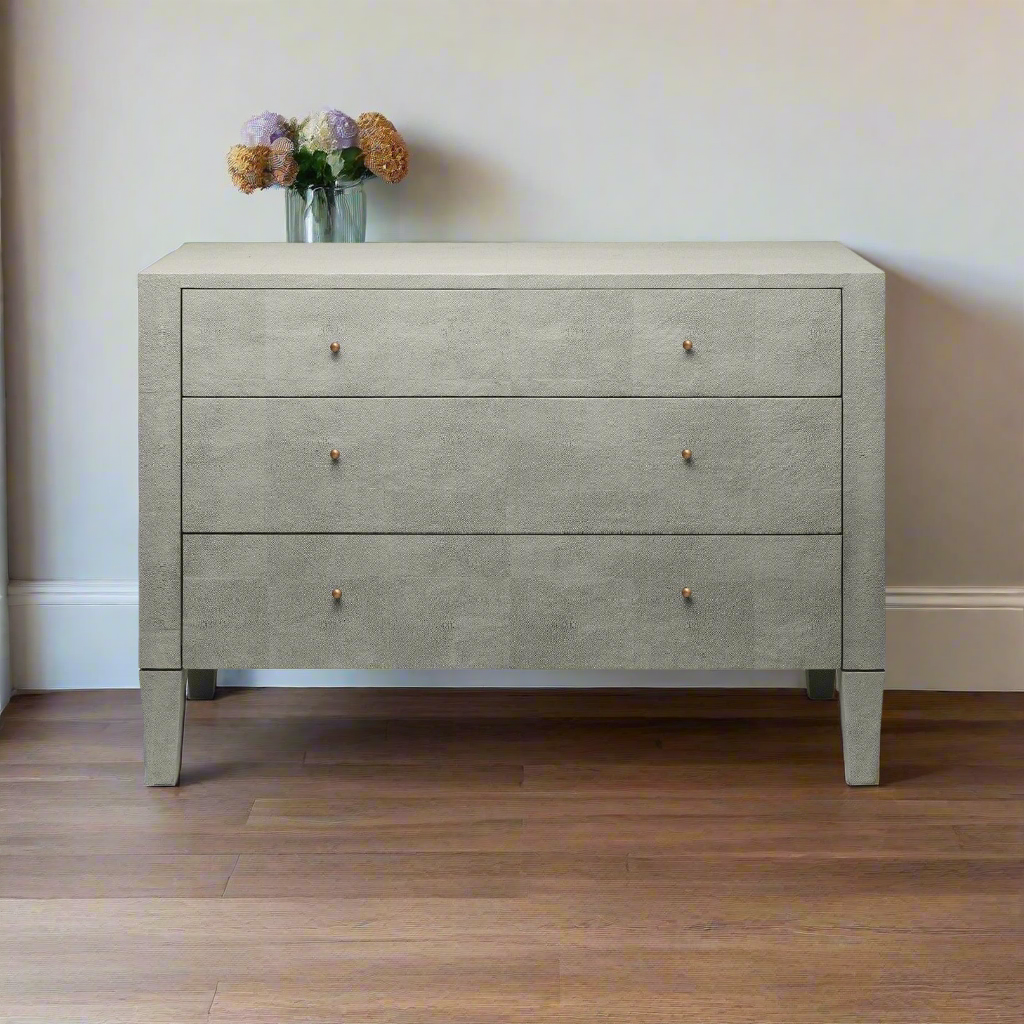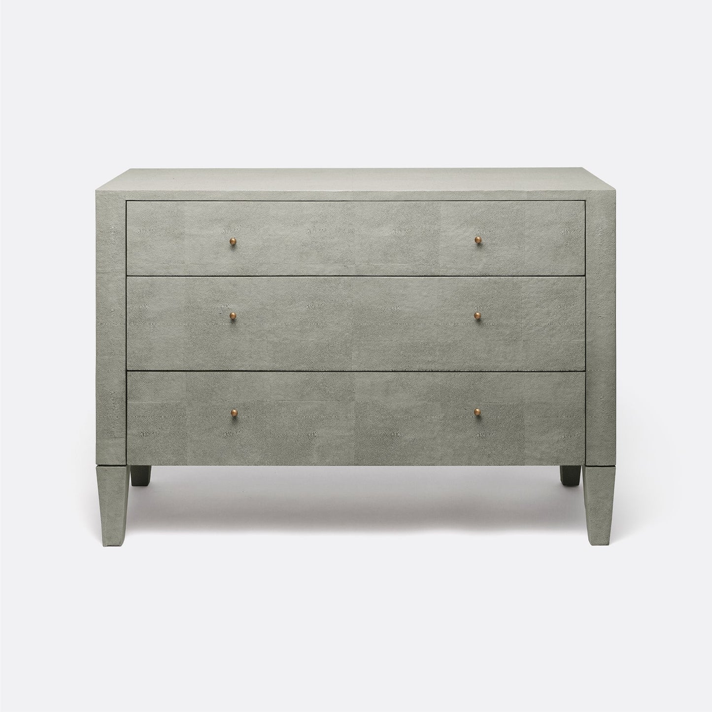 Made Goods Sorin 48" Dresser in Castor Gray faux shagreen reflects modern aesthetics in home decor. This rectangle designed, mid-century chest provides great storage and chic, antiqued brass knobs. Other than the bedroom, consider using the Sorin in the living room as an accent piece or use it in a large entry way.
