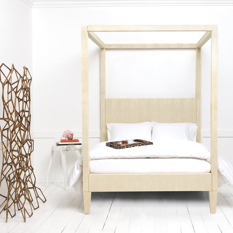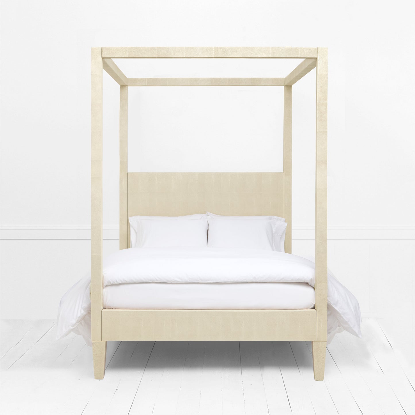 Sorin Bed by Made Goods showcases lavish off white faux shagreen. With a sleek, canopy-style design, the material takes center stage, while the high headboard and tapered legs offer a timeless touch.