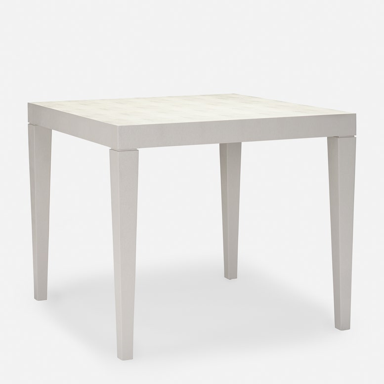 The square Sorin Game Table in French Gray Faux Shagreen by Made Goods reflects a subdued sheen with an element of texture. A standout winner, this furniture piece could also double as a small dining table in the breakfast area of your home.