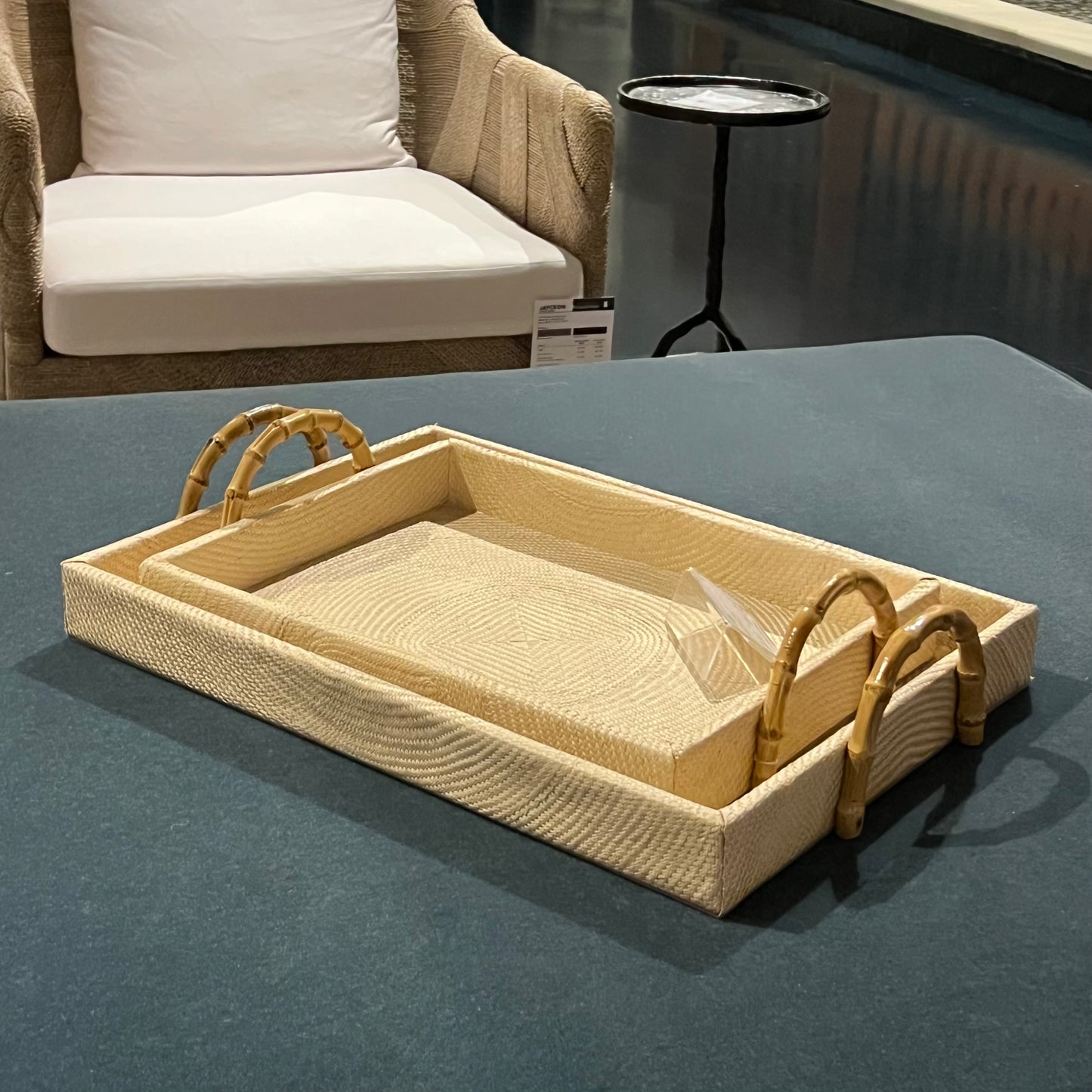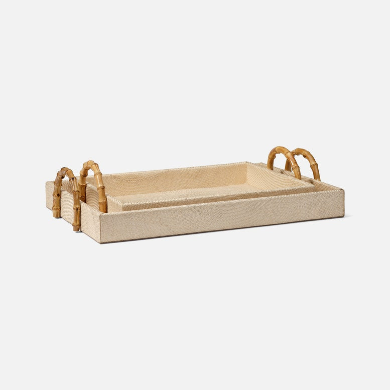 Made from textured buntal fibers, the Stassi Tray Set in Cream Bamboo from Made Goods showcases natural elegance. Curved bamboo handles on the edges present a combination of decor and practicality.