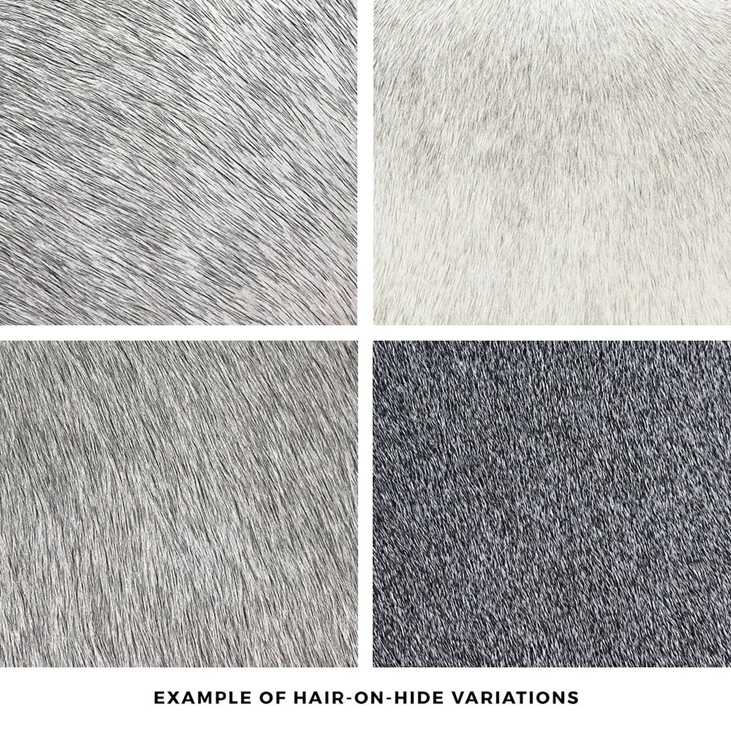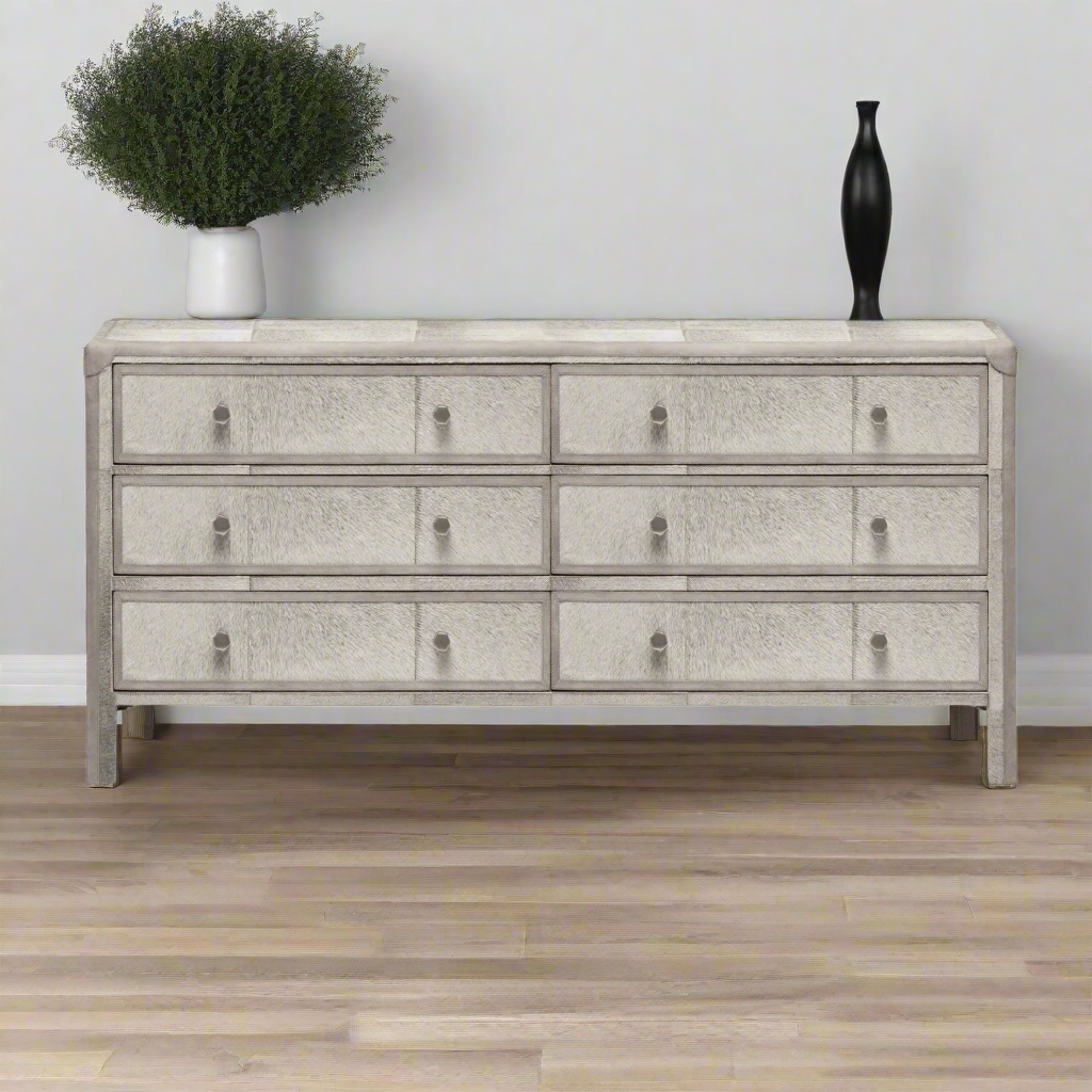 The classic lines of the Terrell 60” Dresser in Gray from Made Goods are fully wrapped in panels of hair-on-hide, accented with gray suede detailing and contrast stitching.