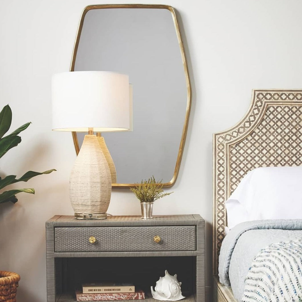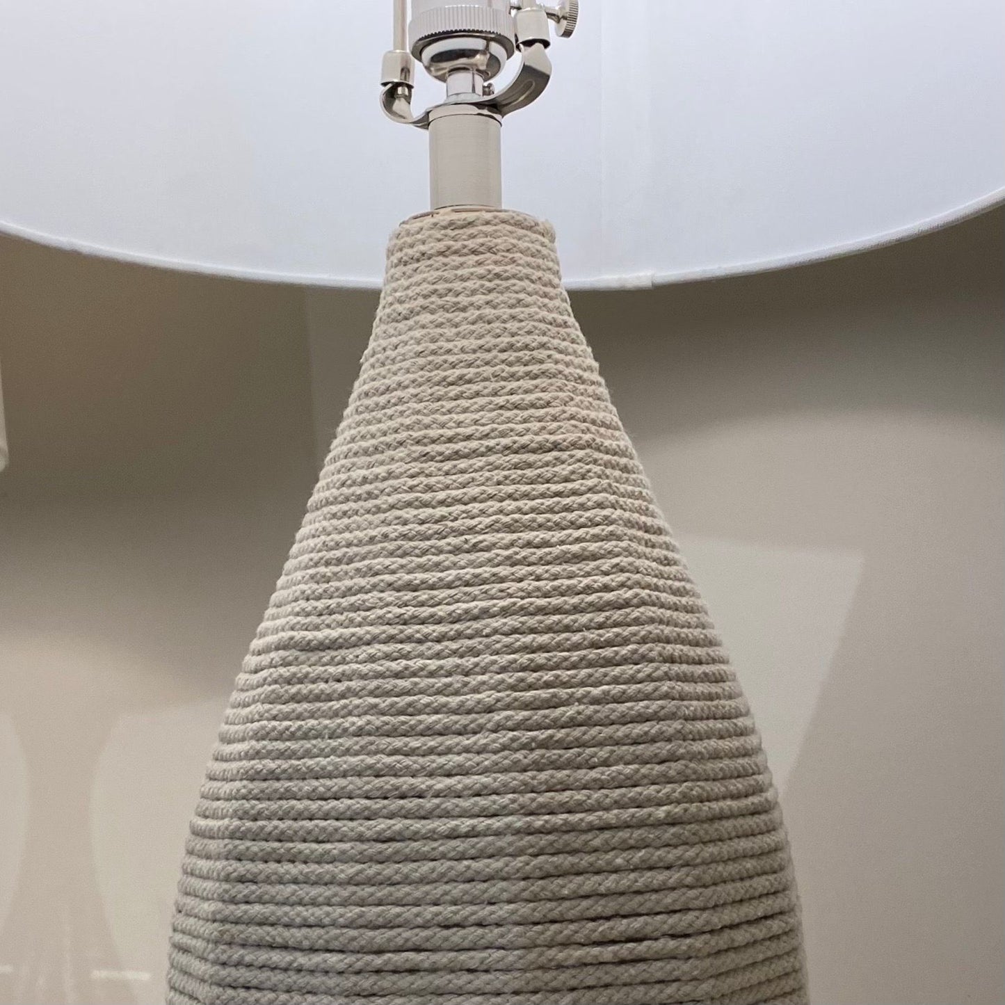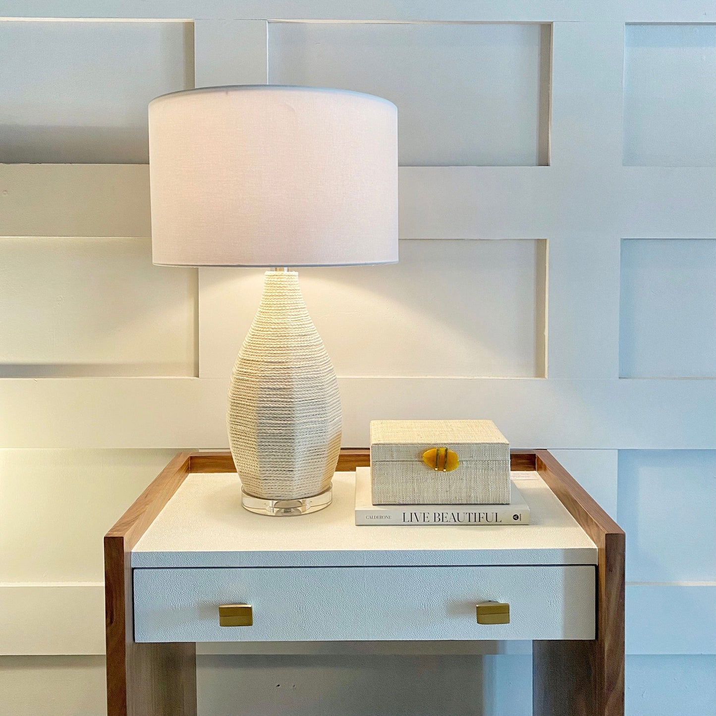 The Thatcher Table Lamp in Cream Rope from made Goods features layer upon layer of cream rope over a faceted table lamp, which rests on a round, clear resin base. A white linen drum shade completes the calming motif.