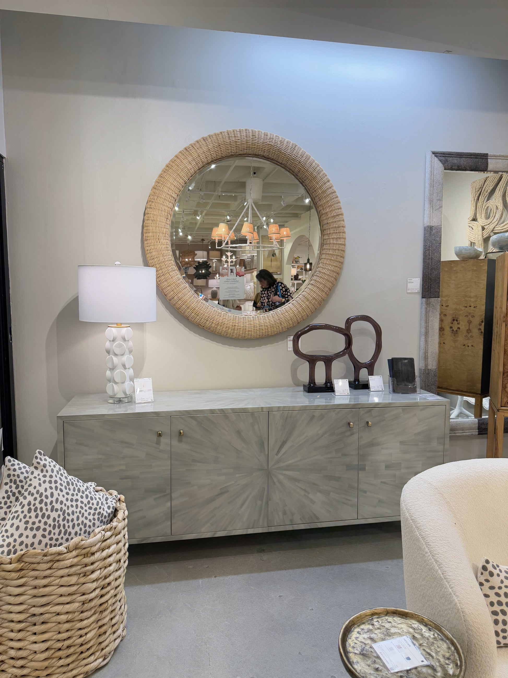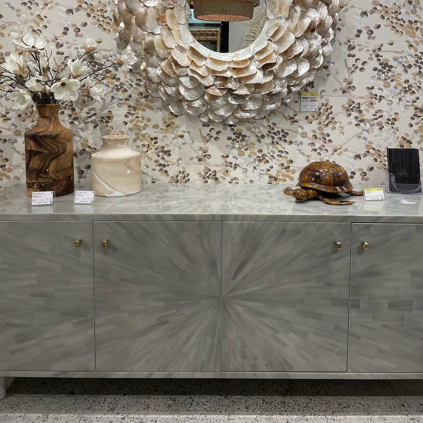 The Made Goods Torion 4 Door Buffet in Light Gray Faux Horn features a rectangular faux horn design and a contemporary style. Utilize this versatile cabinet with four adjustable shelves to provide storage for your dinnerware in the dining room or your books and files in the home office.
