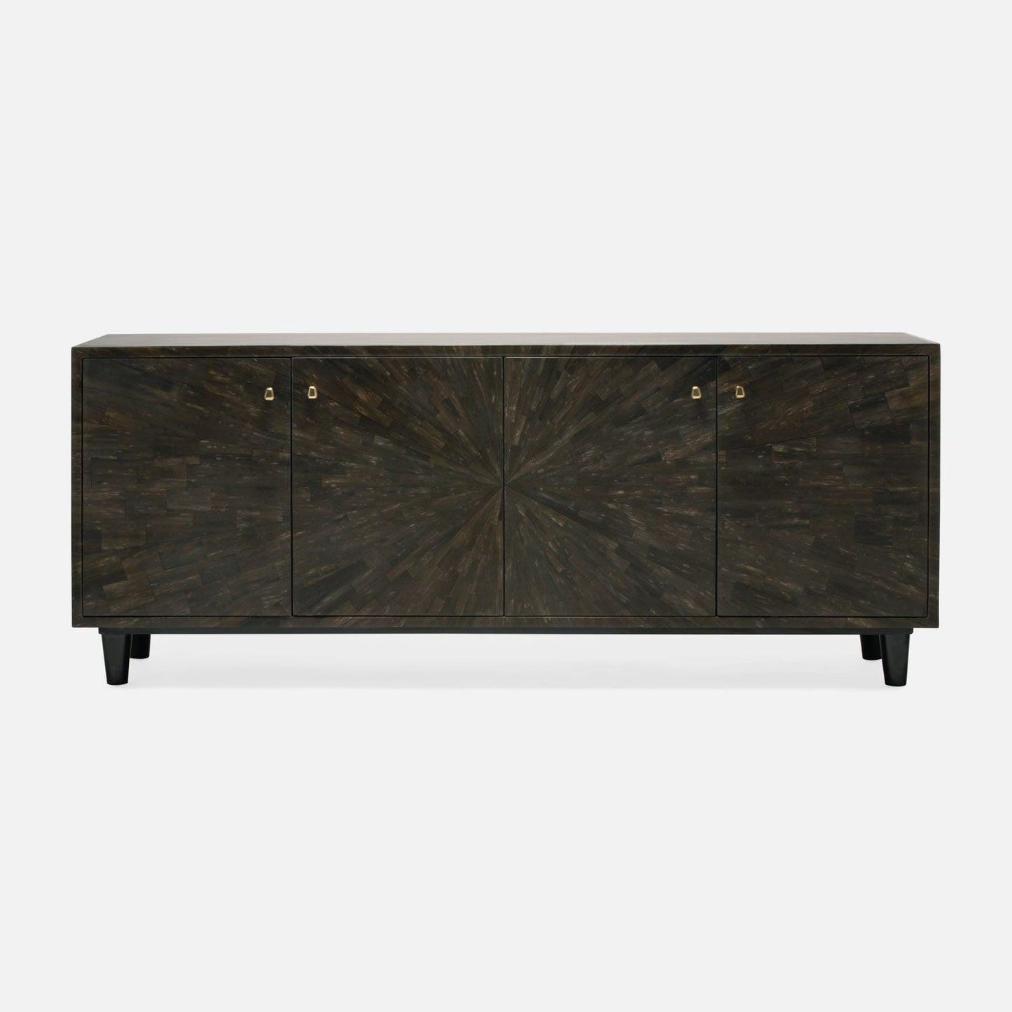 The Made Goods Torion 4 Door Buffet in Umber Faux Horn features a rectangular faux horn design and a contemporary style. Utilize this versatile cabinet with four adjustable shelves to provide storage for your dinnerware in the dining room or your books and files in the home office.