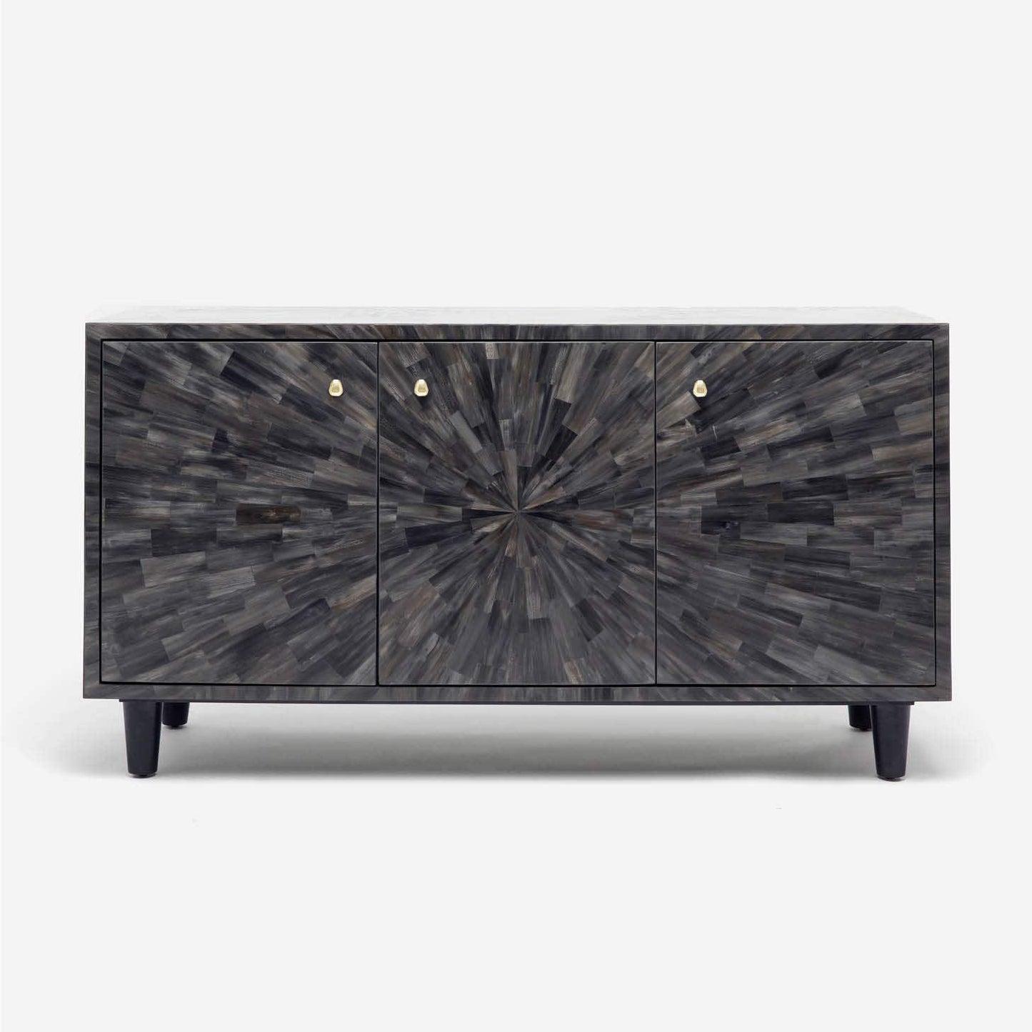 The Made Goods Torion 3 Door Buffet in Dark Faux Horn features a rectangular faux horn design and a contemporary style. Utilize this versatile cabinet with three adjustable shelves to provide storage for your dinnerware in the dining room or your books and files in the home office.