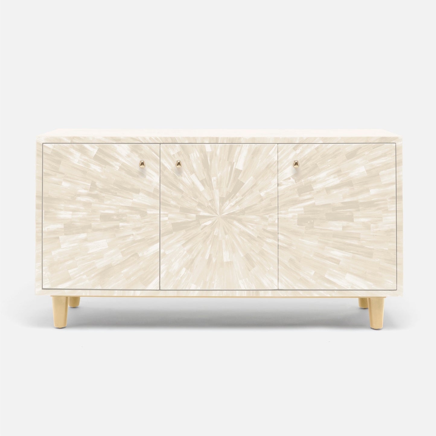 The Made Goods Torion 3 Door Buffet in Faux Ivory Horn features a rectangular faux horn design and a contemporary style. Utilize this versatile cabinet with three adjustable shelves to provide storage for your dinnerware in the dining room or your books and files in the home office.