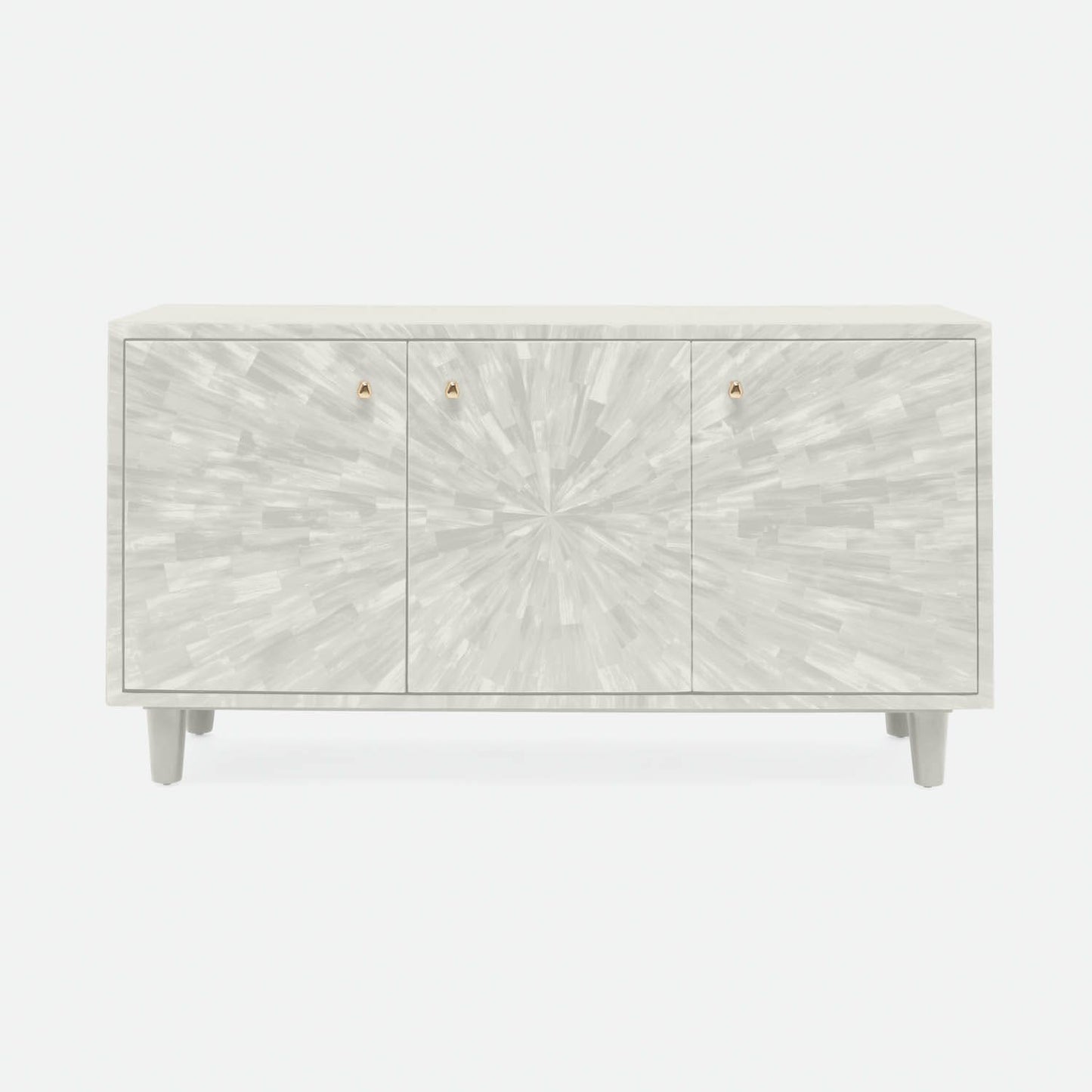 The Made Goods Torion 3 Door Buffet in Light Gray Faux Horn features a rectangular faux horn design and a contemporary style. Utilize this versatile cabinet with three adjustable shelves to provide storage for your dinnerware in the dining room or your books and files in the home office.