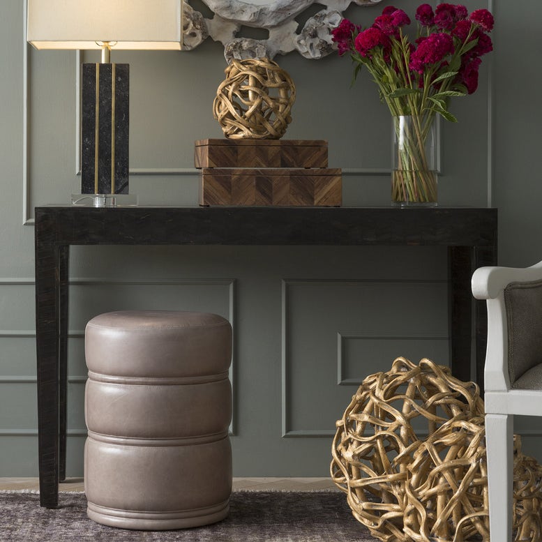 The Made Goods Vaughn Stool in Storm Leather features a simple silhouette. This round stool offers sophisticated extra seating for homes or offices. Showcasing a textural, quilted design on durable, full grain leather, the leather Vaughn can be easily moved to accommodate more people in the living room or home office!