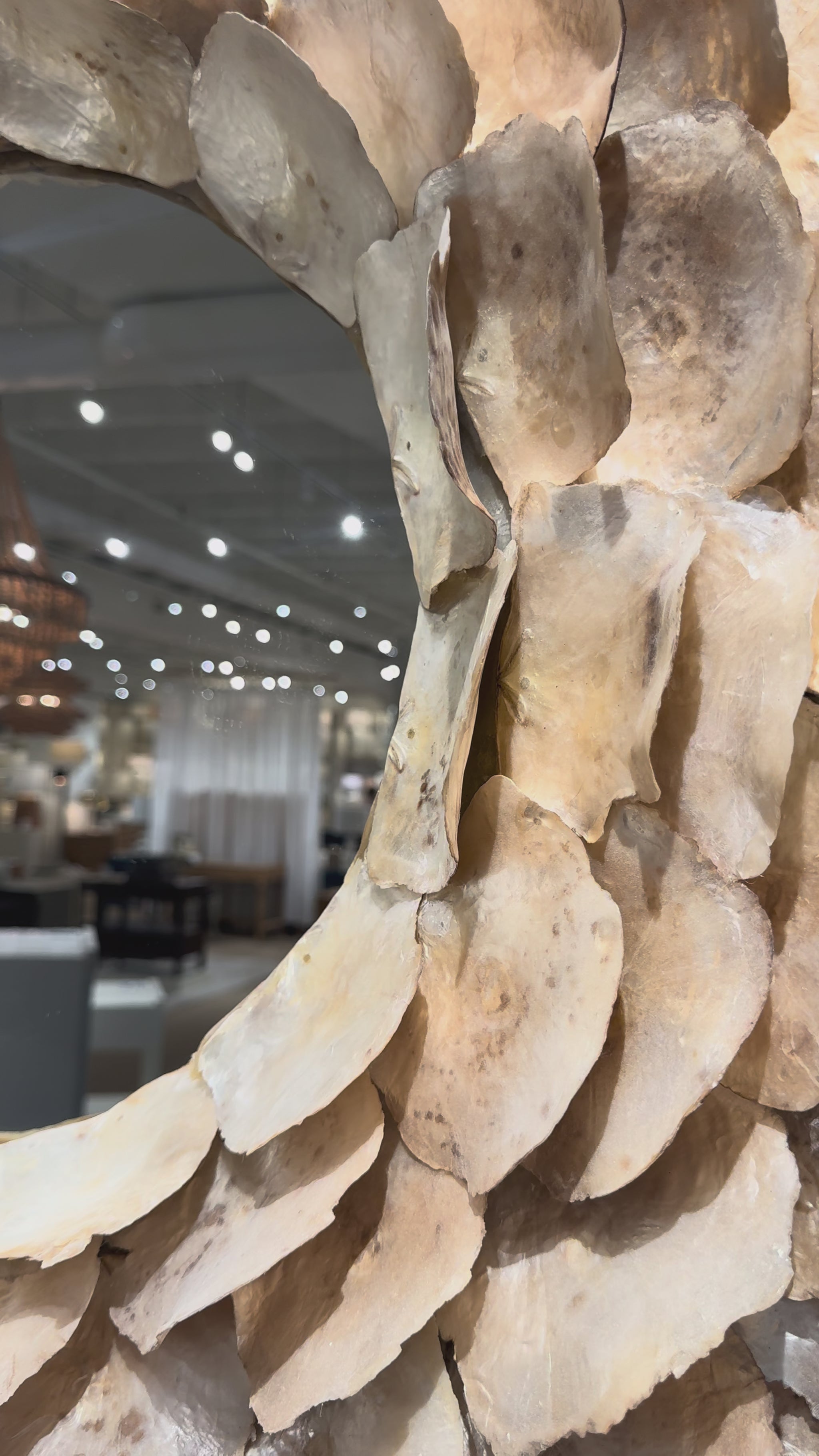 The Venus Mirror in Frost Saddle Oyster Shell from Made Goods features small shells at the mirror's edge that gets larger, up to 12 inches, as they radiate out from the mirror's center. The Venus is feminine, organic, modern, and dramatic. The layers of organic shells give the mirror an approximate 6" depth.