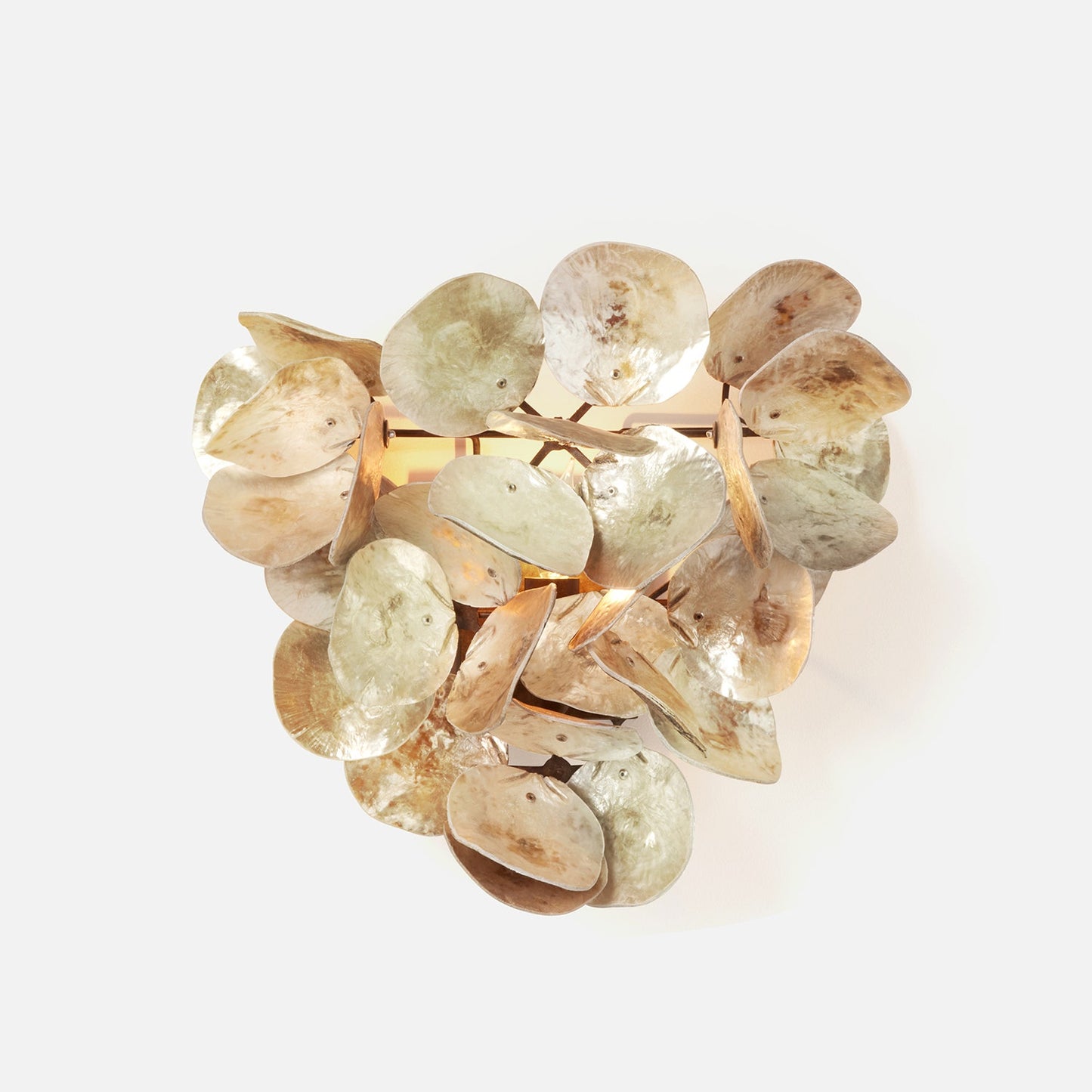 The Venus Sconce from Made Goods in Frost Saddle Oyster Shell is a handcrafted and unique statement piece. The florets of saddle oyster shells are meticulously placed, resulting in an organic and artistic effect that sets the Venus Sconce apart.