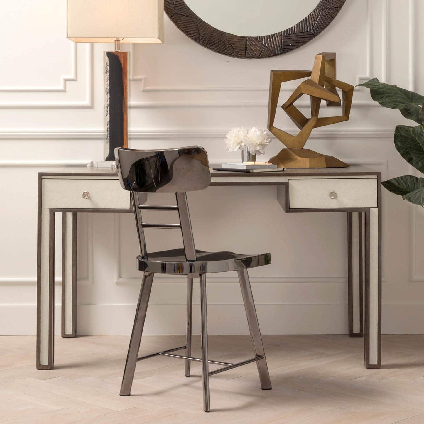 Gray-stained oak and vintage faux shagreen make up the unexpected pairing that creates the defined look of the Wolfred Desk in Pristine Vintage Faux Shagreen and Gray Stained Oak from Made Goods. The pared down silhouette is highlighted by the wood trim- shagreen adds a contrasting texture. Silver hardware finishes the piece.
