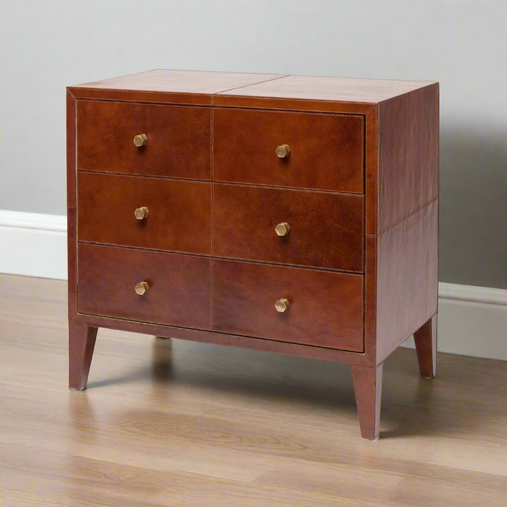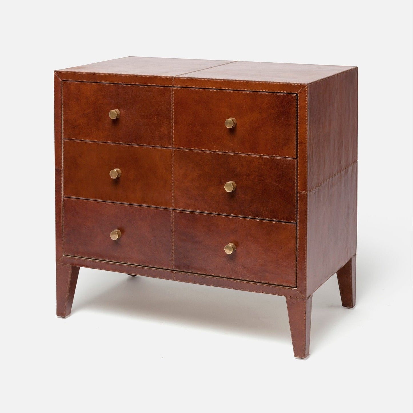 Create a sophisticated feel in any room with the York Double Nightstand in Tobacco Leather from Made Goods. This piece is adorned with hexagonal hardware, adding a touch of modernity to its tailored design. The drawers are lined with canvas, providing both functionality and style.