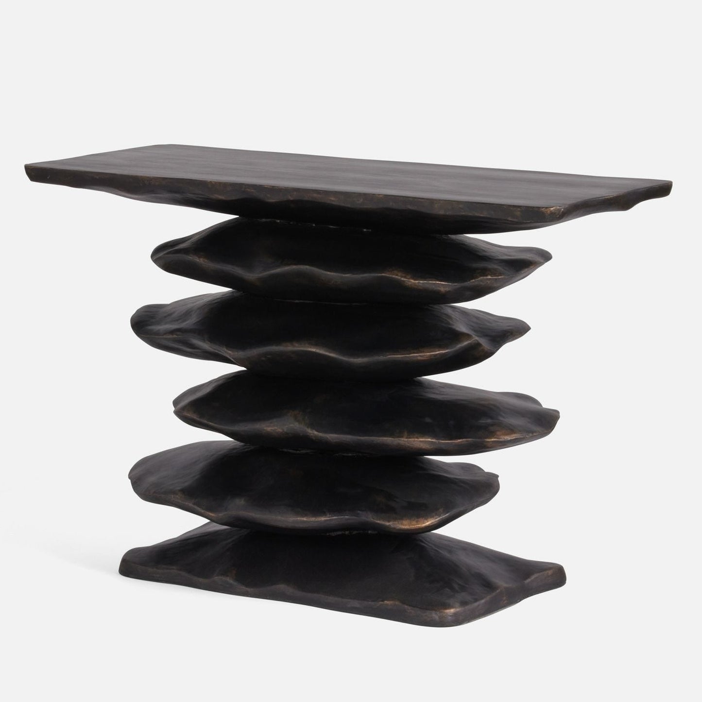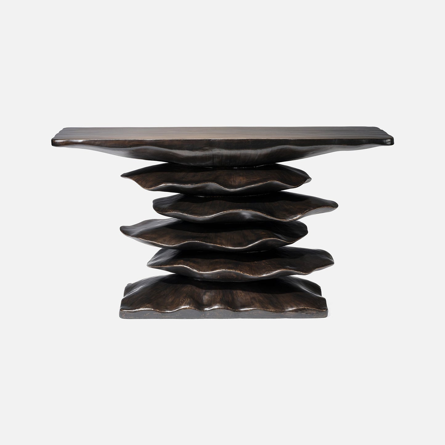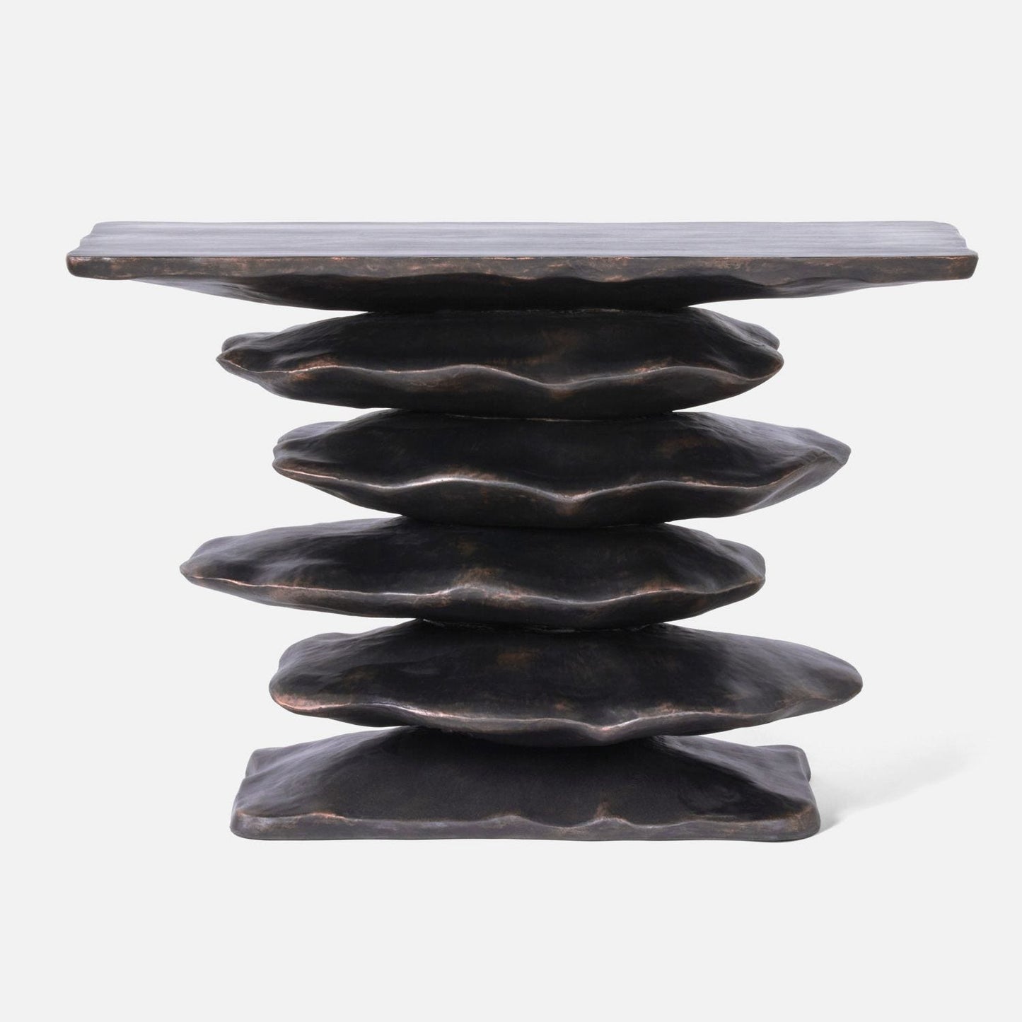 Stacked cast resin creates the organic shape of the Zuri Console in Antique Bronze from Made Goods. The Zuri Console is both whimsical and refined, and is a stunning piece to style any entry way, living room, or home office.