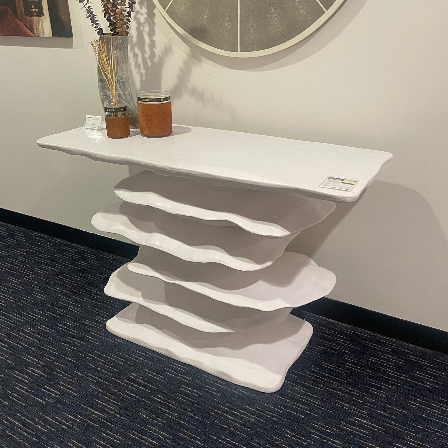 Stacked cast resin creates the organic shape of the Zuri Console in Flat White from Made Goods. The Zuri Console is both whimsical and refined, and is a stunning piece to style any entry way, living room, or home office.