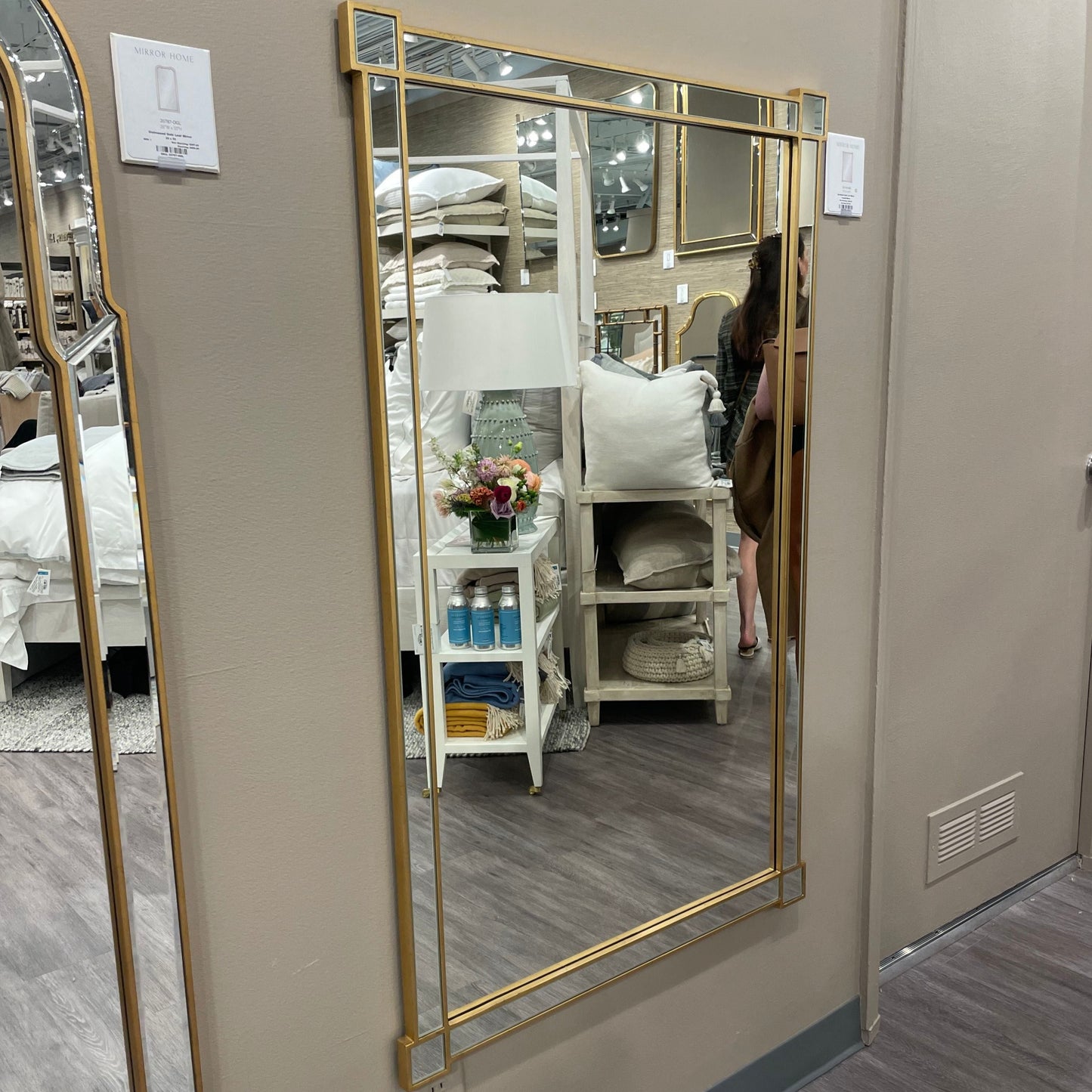 The Celerie Kemble Burnished Gold Leaf Mirror from Mirror Home is a framed, hand-carved mirror finished in burnished gold leaf. Non-beveled center mirror surrounded by hand-cut and beveled mirrors.