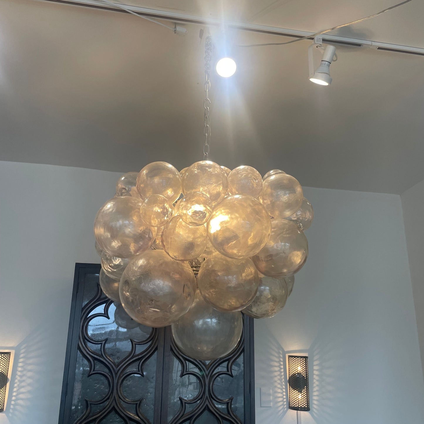 The Muriel Chandelier from Oly Studio is a transitional alternative to a crystal chandelier. This bubble chandelier forms a perfect cluster, bringing modern coastal living home. Crafted from cast resin, each bubble is individually attached to a metal structure. *Choose from silver or brass chain and ceiling mount.