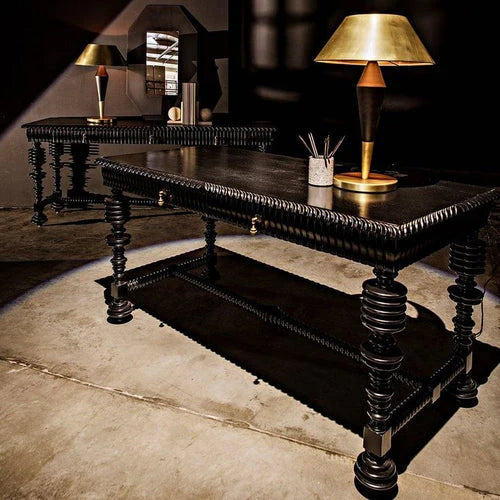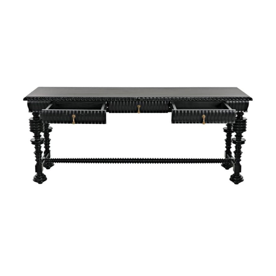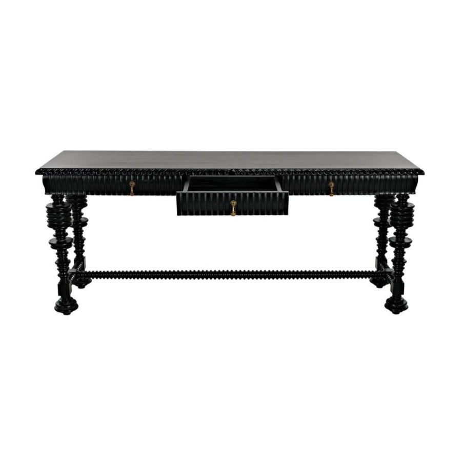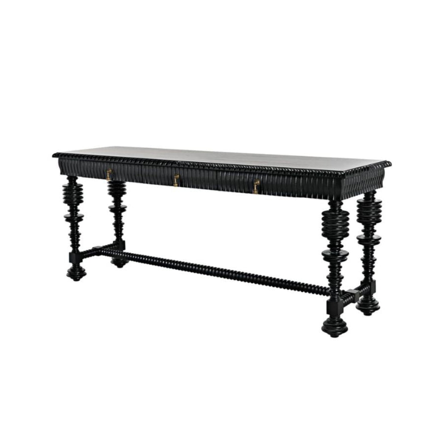 The Portuguese Console, hand-rubbed in black by Noir, showcases meticulous and laborious turning and carving on all four sides. The lustrous and satiny hand-rubbed finish enhances the elegance of this piece, while three drawers are adorned with intricate antique brass teardrop pulls.