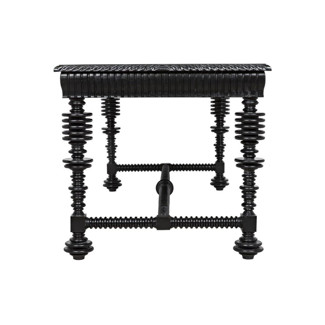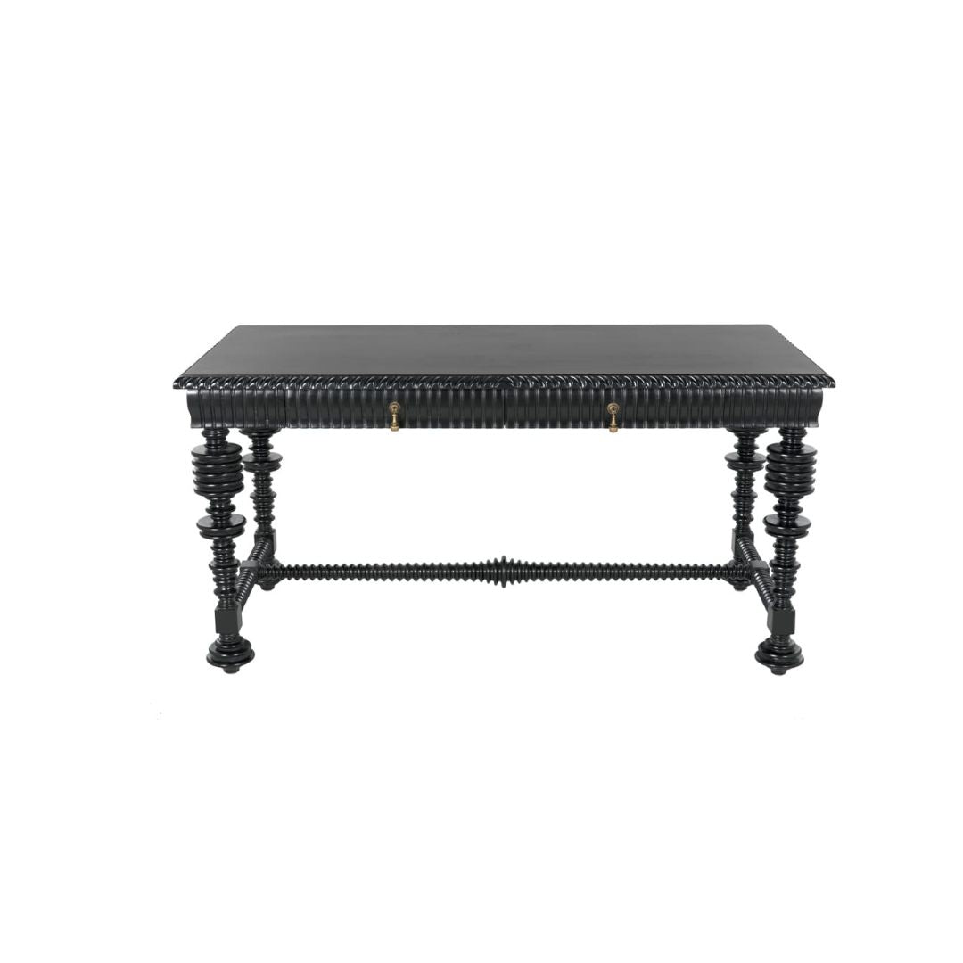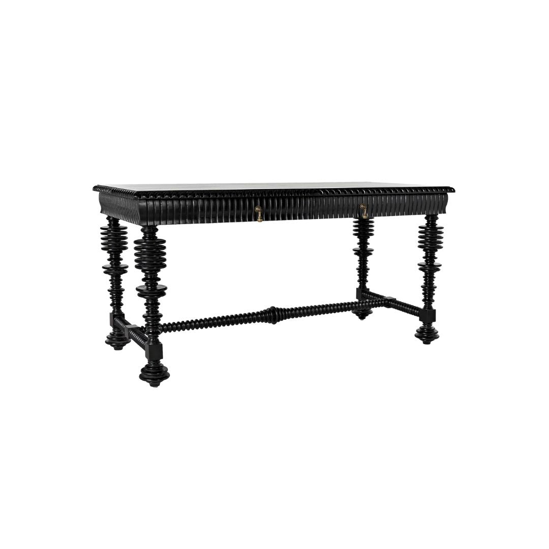 Experience the exquisite craftsmanship of the Noir Portuguese Desk in Hand Rubbed Black. This stunning piece features beautiful spool turning, intricately carved apron, and mahogany construction. The rich hand-rubbed finish and brass pulls add a touch of elegance, while spacious drawers provide ample storage.