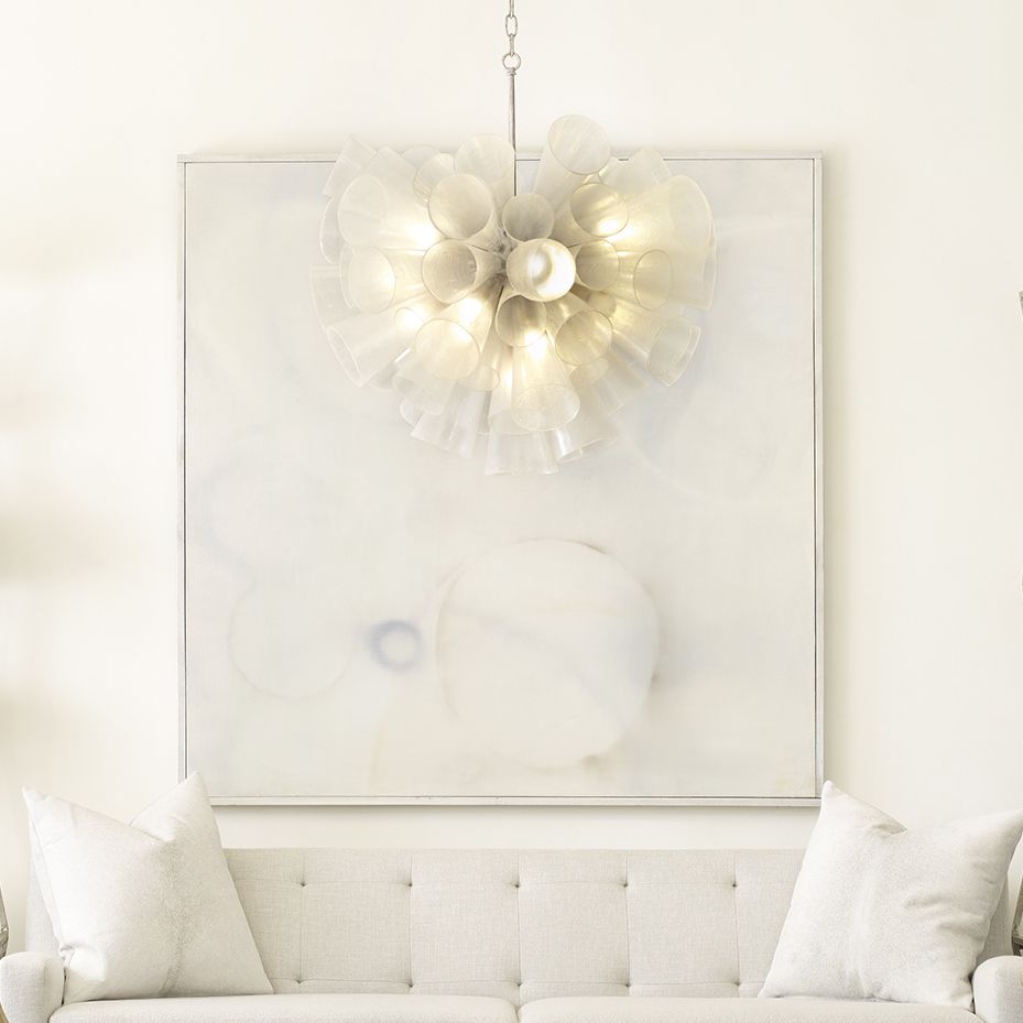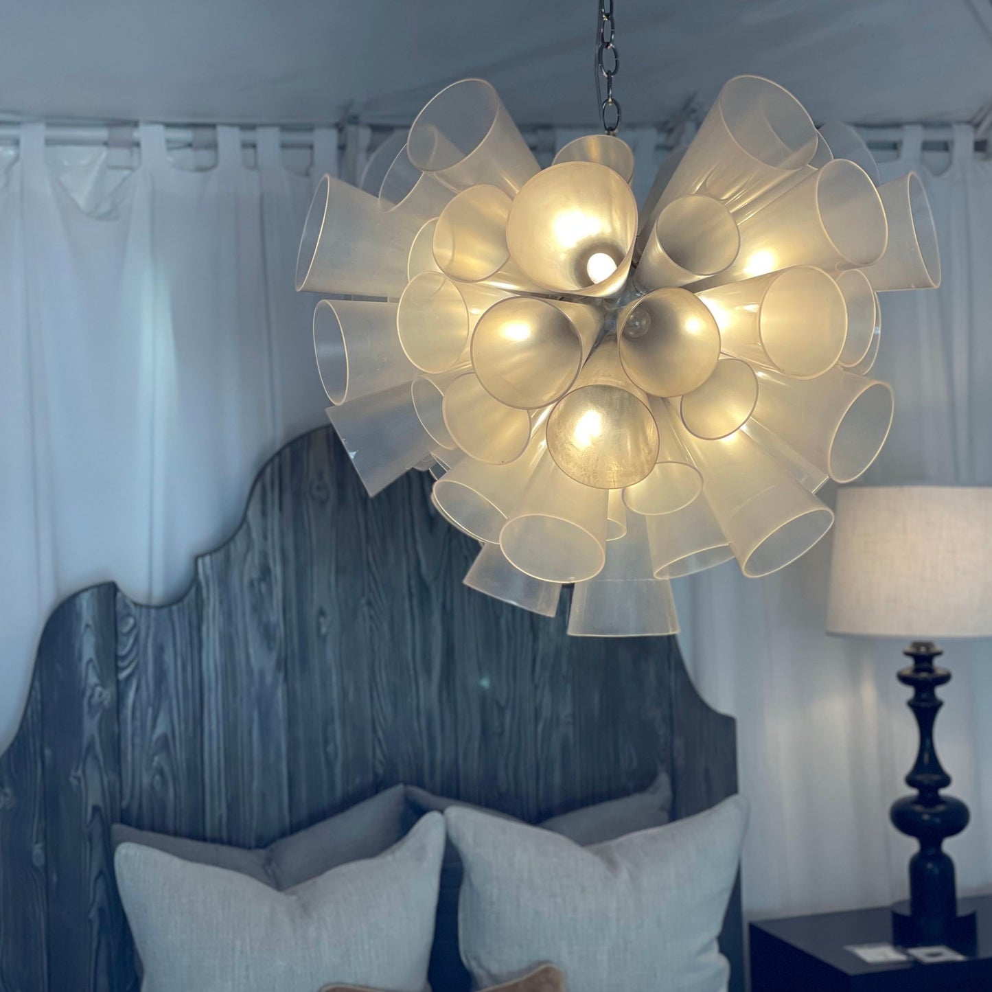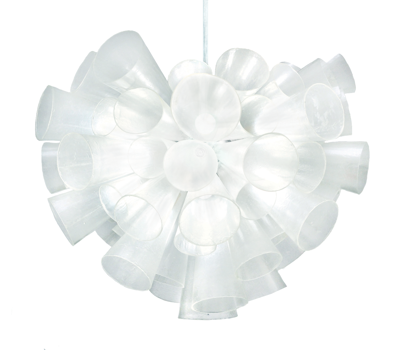 The Fanad Chandelier from Oly Studio delivers a shimmering statement piece to your home. This cast resin chandelier forms a large cluster of curved cone-like shapes, creating dramatic shadows and light when illuminated. Chandeliers like the Fanad add a sophisticated ambiance to entryways, dining rooms, and living spaces.