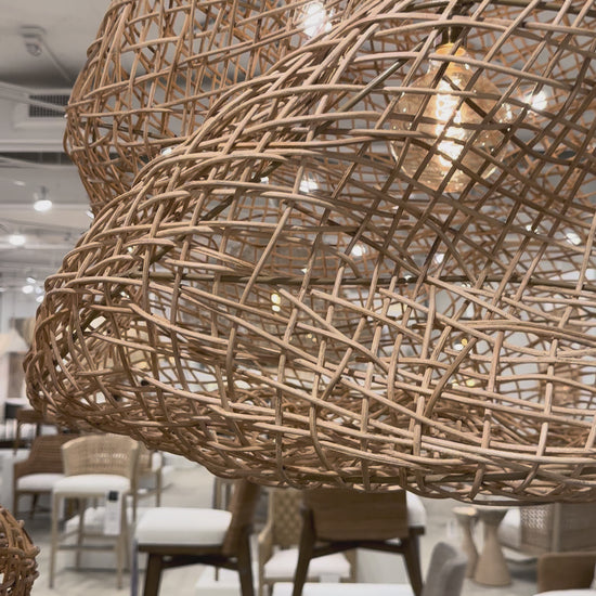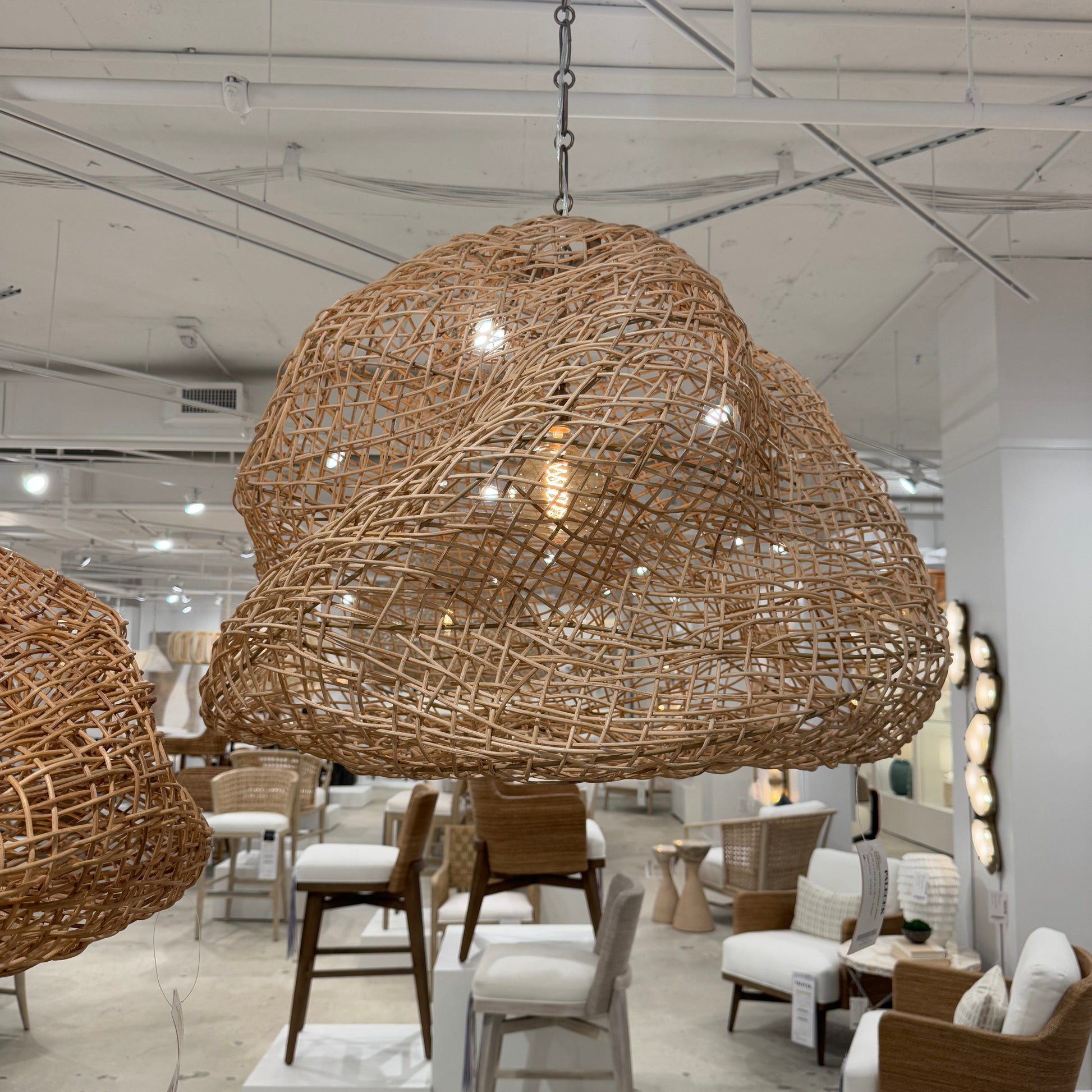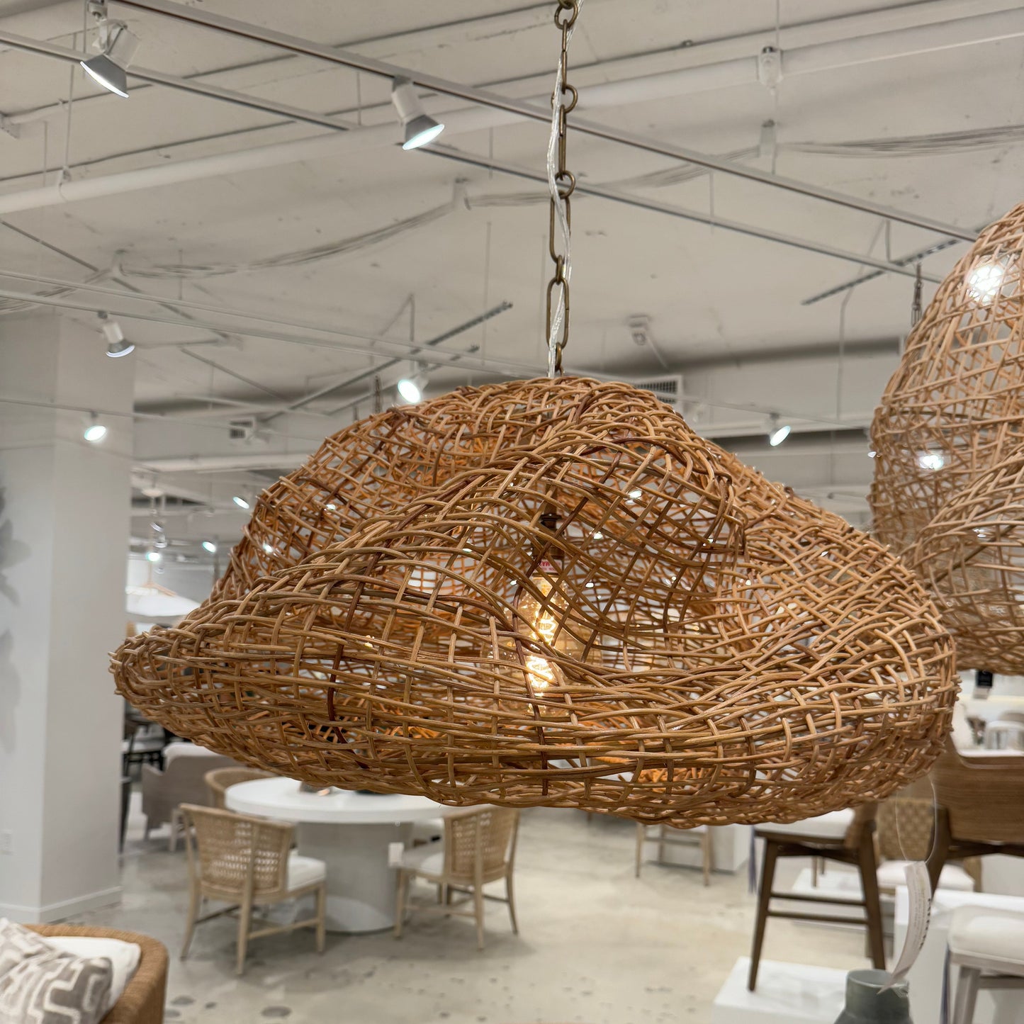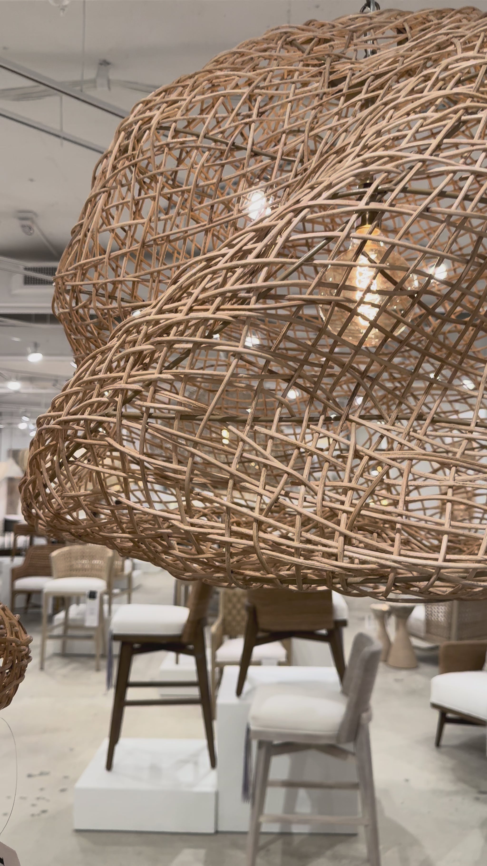 The Andorra Pendant in Natural Rattan by Palecek features split rattan open weave in a natural finish hand-formed over a metal frame. The pendant comes with an antique brass finished metal chain and canopy hanging kit. Professional installation is recommended.