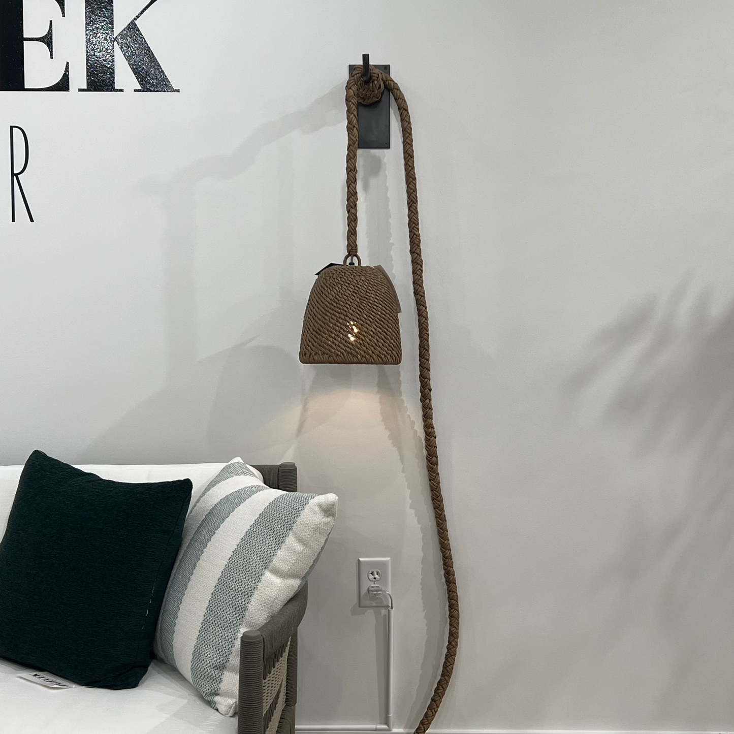 Palacek's Asilomar Outdoor Wall Pendant in Natural has a metal frame and natural synthetic rope. Designed by Jeffrey Alan Marks, it comes with a bronze wall mount and is suitable for covered outdoor use. Professional installation is recommended.