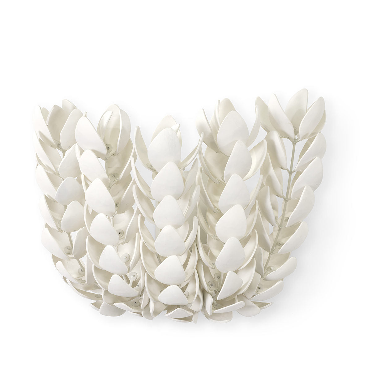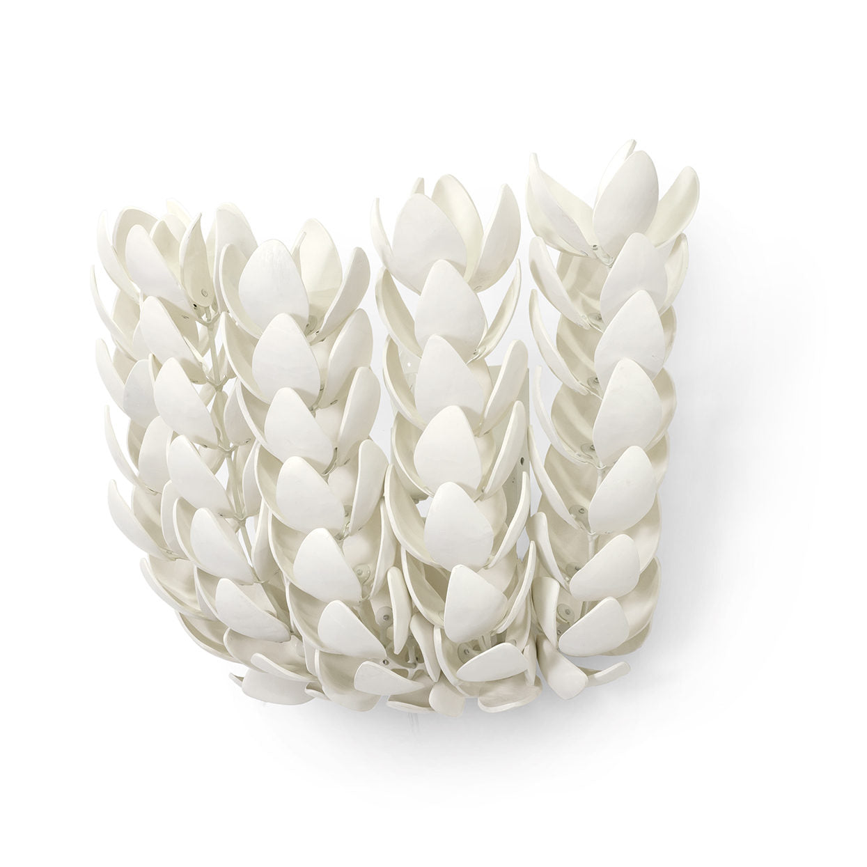 The Coco Magnolia Sconce from Palecek features coco shells hand-cut into petal forms in an off-white finish over a powder-coated metal frame.