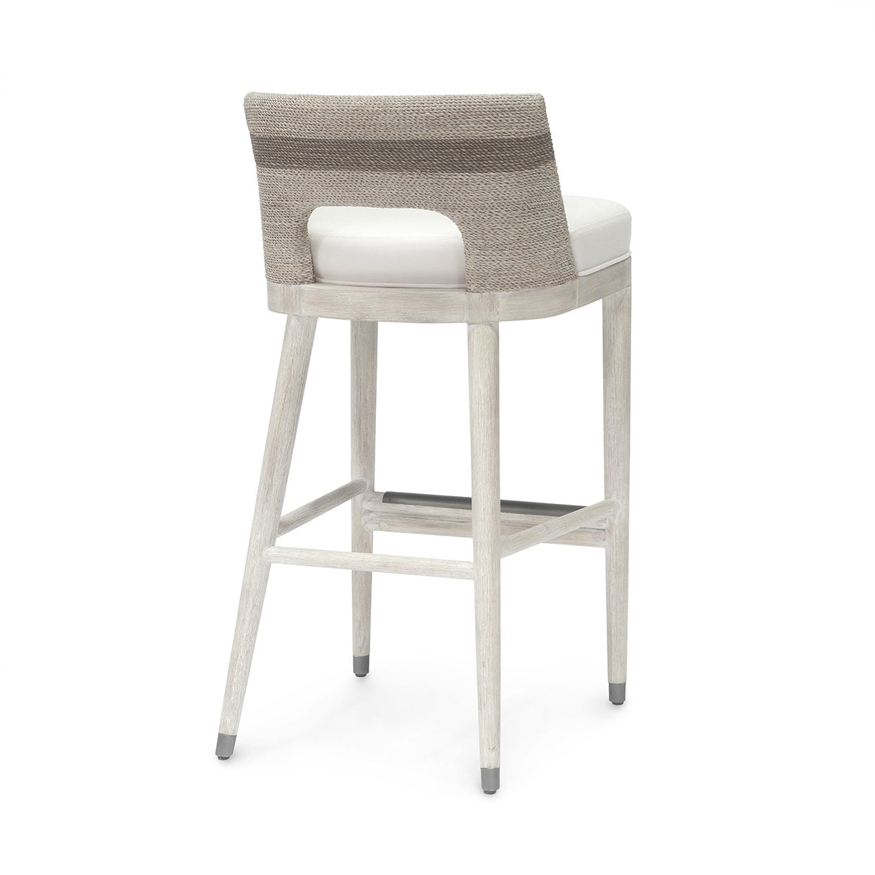 The Fritz Rope Bar Stool in Fog White from Palecek features a hardwood frame and legs in whitewash with pewter finish foot caps and footrest on a front stretcher with a double-wall back of hand-twisted Lampakanai rope in a fog white finish with taupe stripe detail and a fixed upholstered seat with sailcloth salt indoor/outdoor fabric. Designed by Kirk Nix exclusively for Palecek.