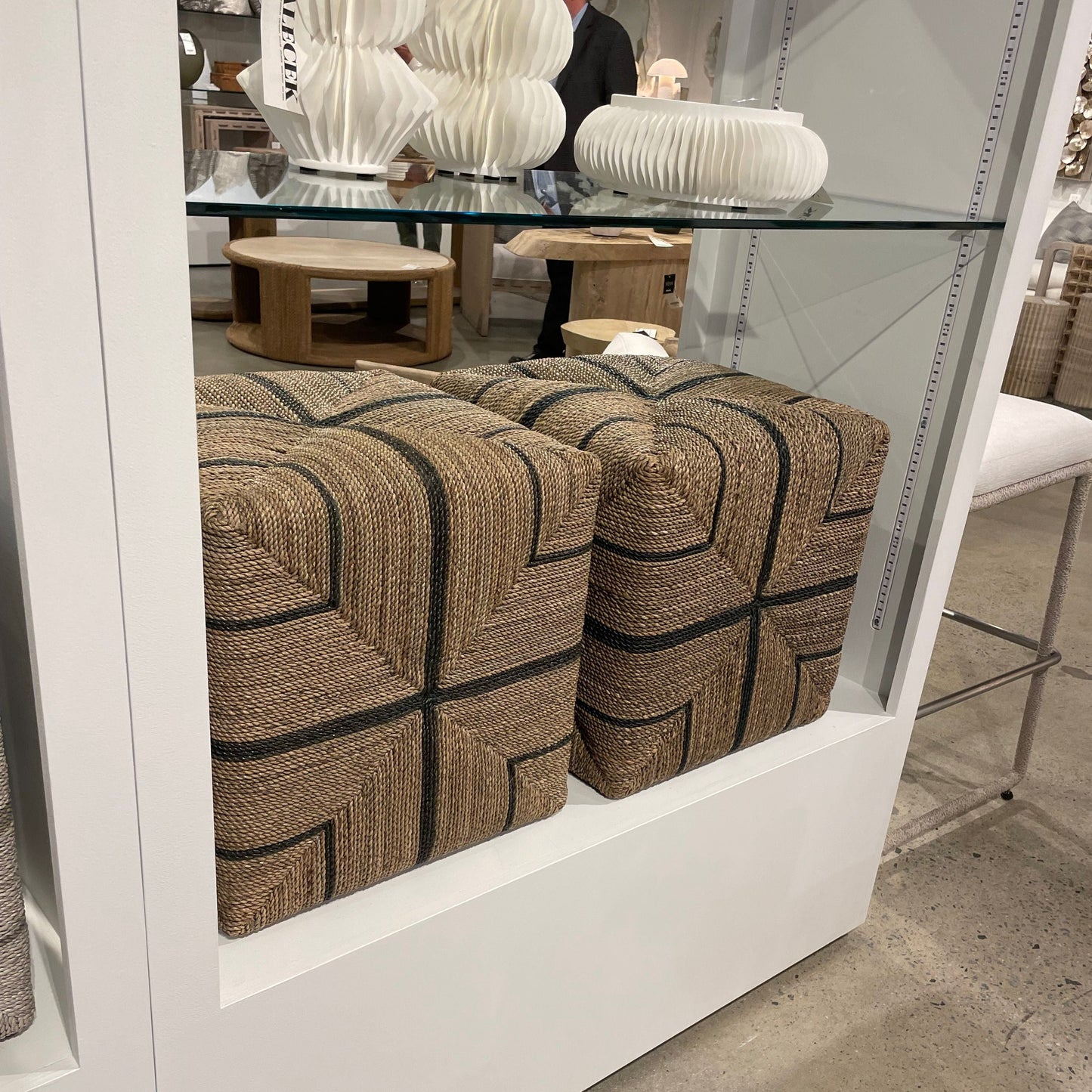 As part of the Kirk Nix Collection, the Fritz Rope Square Ottoman by Palecek offers coastal elegance for your home. Hand-twisted Lampakanai rope in a gray finish with black stripes cover a hardwood frame on this versatile extra seat or footrest.