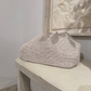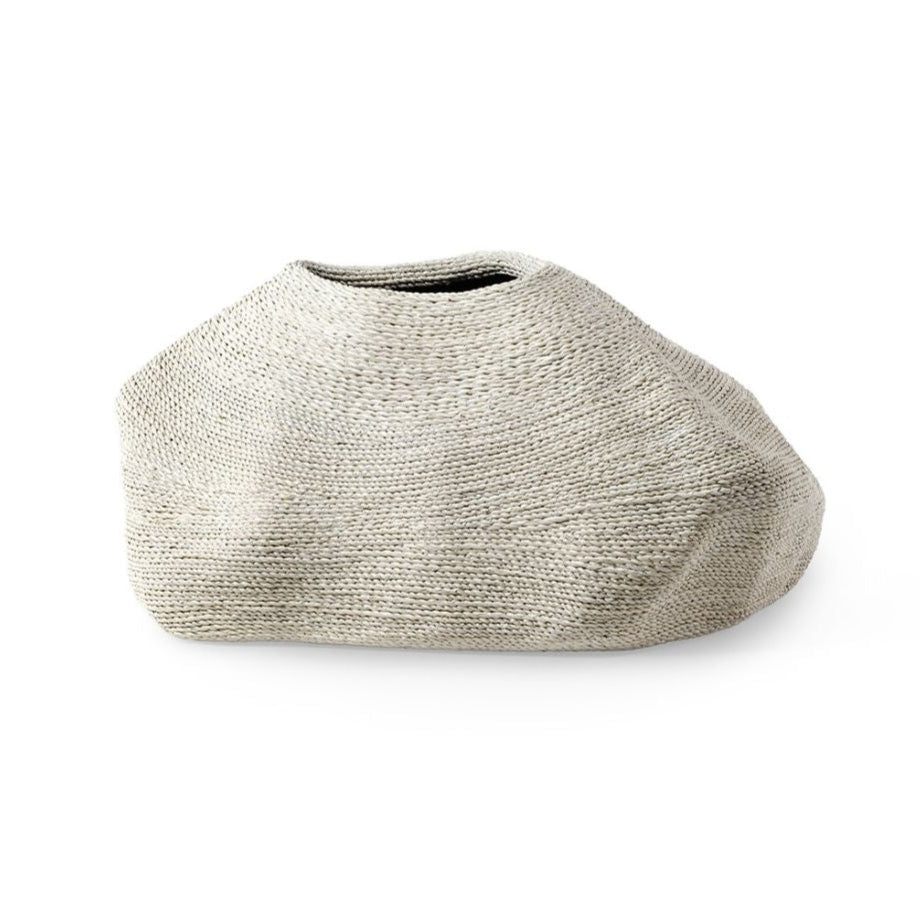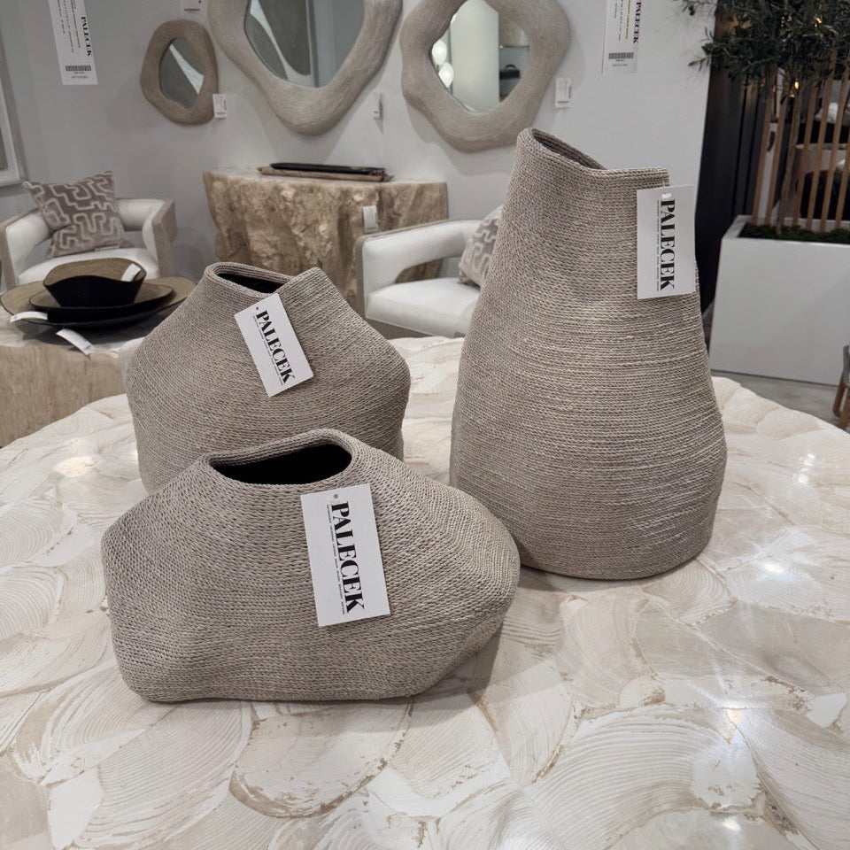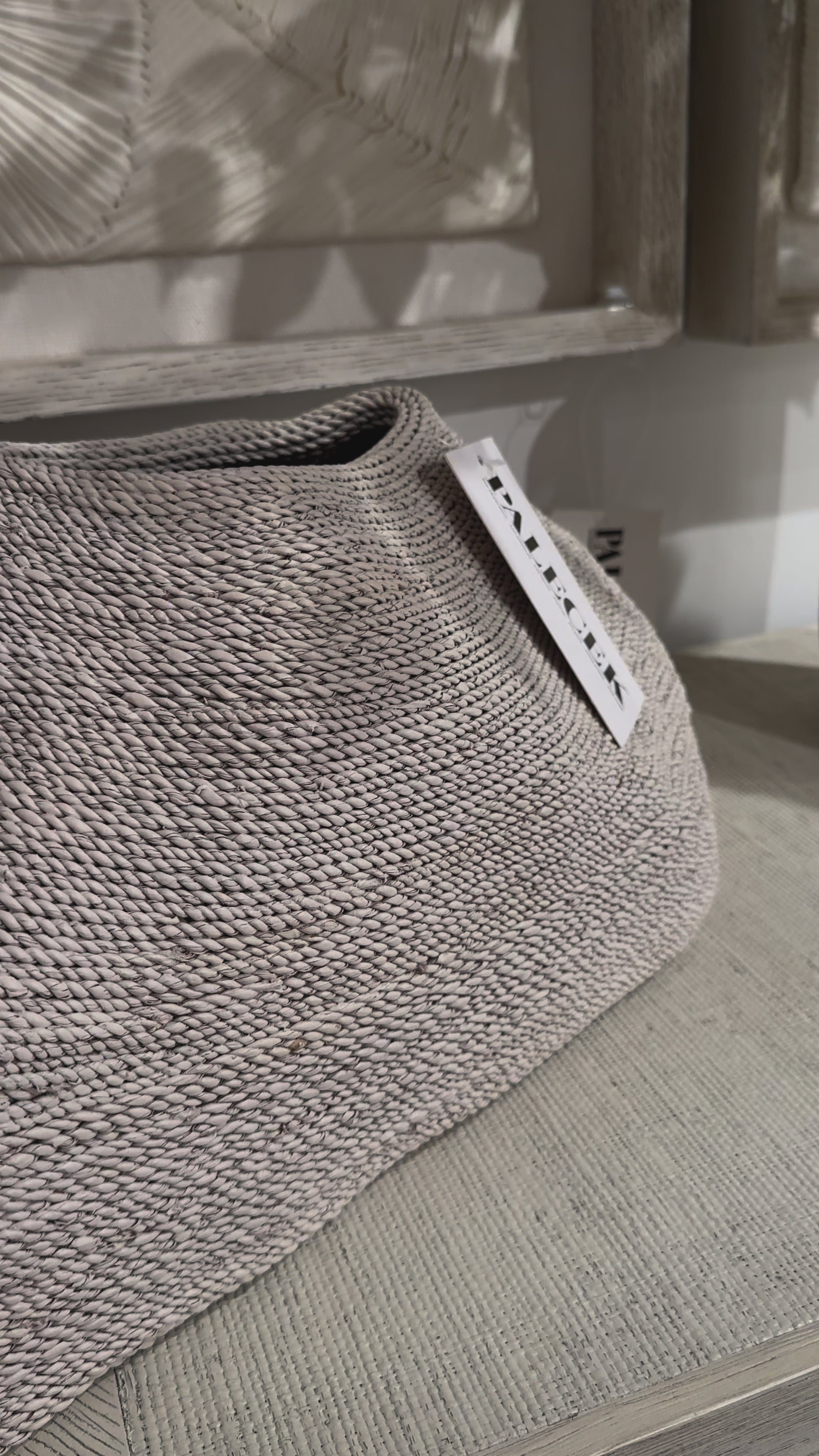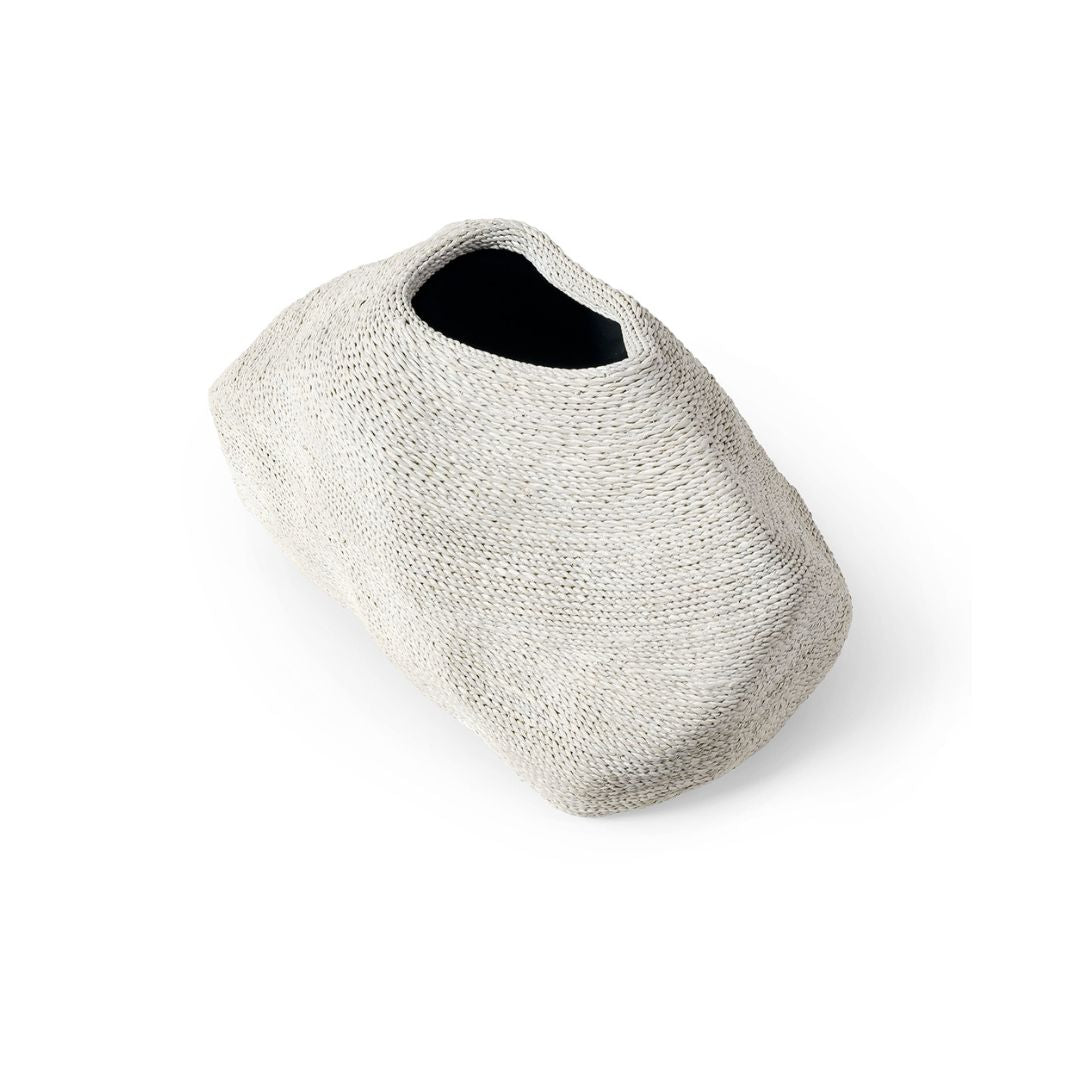 The Jaden Urn Short White, crafted by Palecek, boasts a metal frame wrapped in hand-woven lampakanay rope with a sleek matte finish, providing a unique and stylish addition to any space.
