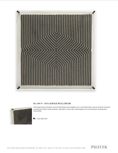 The Kya Acrylic Wall Decor from Palecek features hand-dyed white and black coconut shell beads sewn together over a soft white fabric with an acrylic front panel and mounted with black metal hardware. This striking wall decor comes with metal hangers for mounting both vertically and horizontally for added versatility.