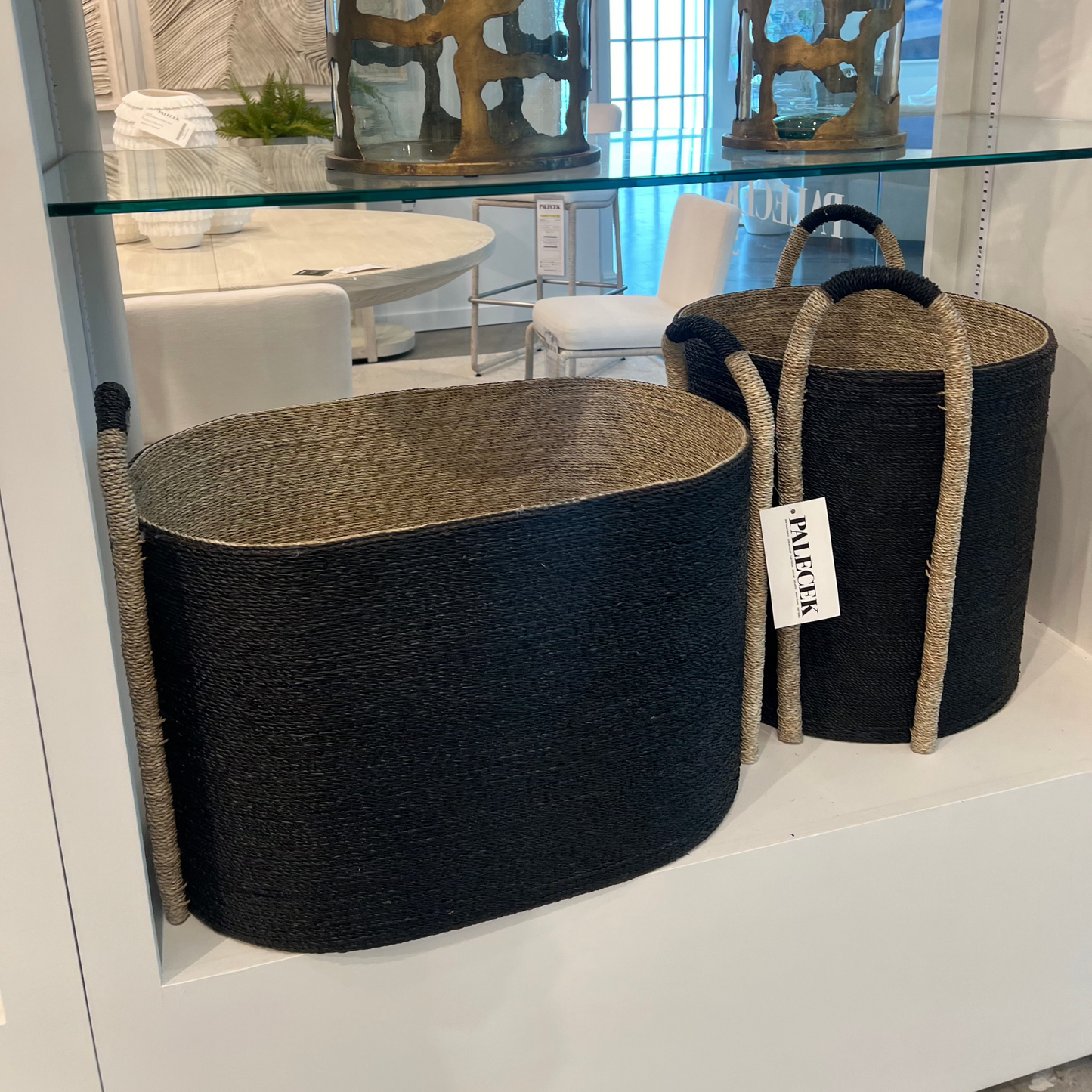 This hand-woven Mckinley Oval Basket in Black Seagrass boasts a double wall design, featuring natural seagrass on the inside and black-grey dyed seagrass on the outside. Its sturdy construction is further enhanced with a hard coat glaze, ensuring the basket retains its shape.