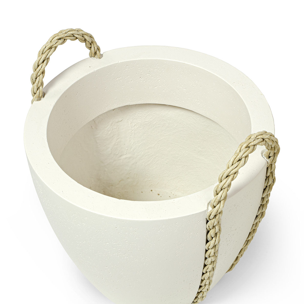 The Small Nadine Planter from Palecek features white textured stonecast that is accented with large hand-braided handles and embedded details. The Small Nadine Planter is the perfect addition for styling any indoor living spaces and is also suitable to be displayed outdoors.