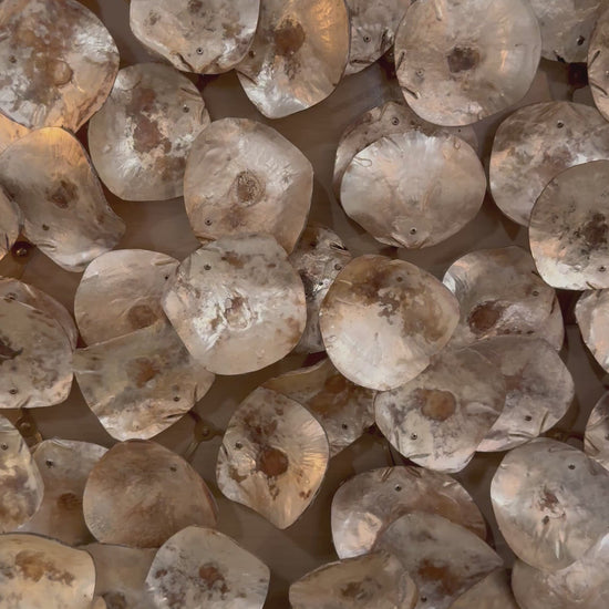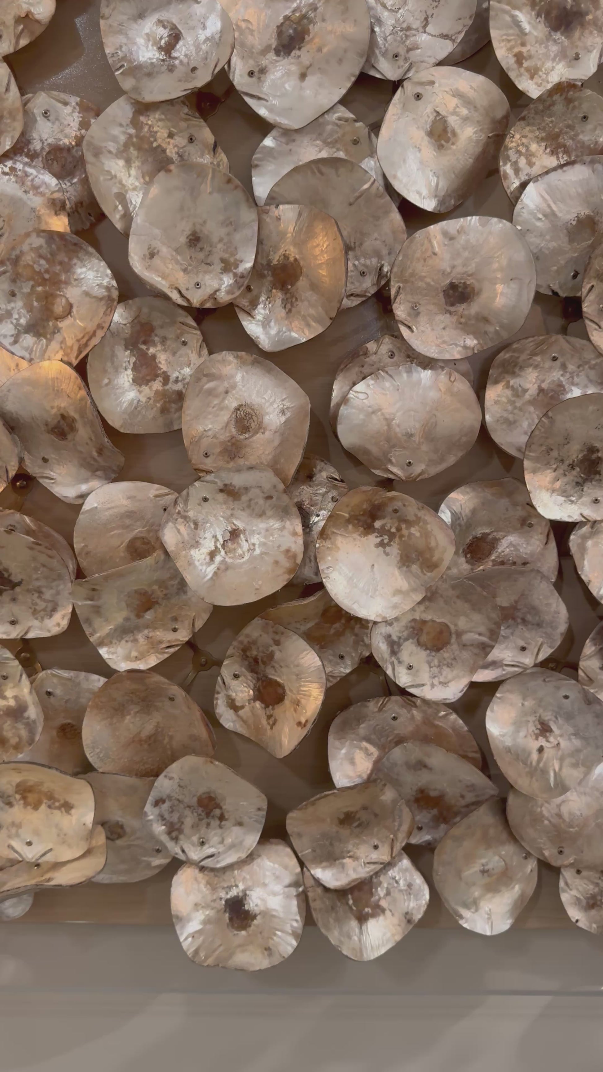 The Playa Wall Decor from Palecek features cultured saddle oyster shells hand placed in a petal-like design with a clear acrylic and stainless steel frame. Natural markings and indentations are part of the inherent beauty of oyster shells and add interest to the piece.