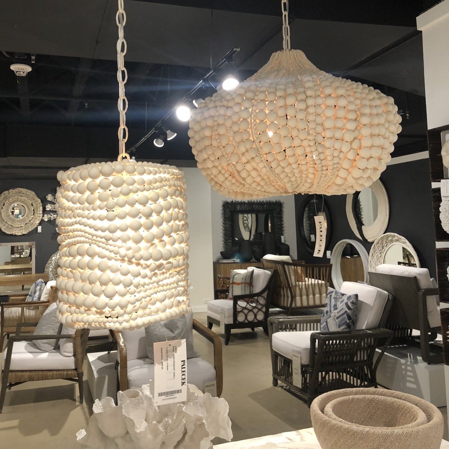 The Point Dume Pendant from Palecek features wood spheres in a cream finish hand-sewn together over a metal frame. This elegant pendant comes with a cream-finished chain and canopy hanging kit.