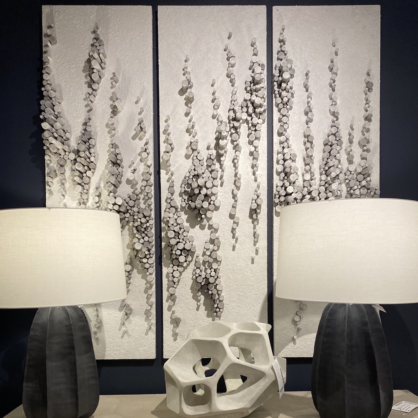 The Rainfall Rattan Wall Decor Set of Three from Palecek features hand-cut pole rattan in various sizes and lengths arranged over three white textured hardwood panels. This strikingly unique wall decor includes metal cleats for mounting both vertically and horizontally.